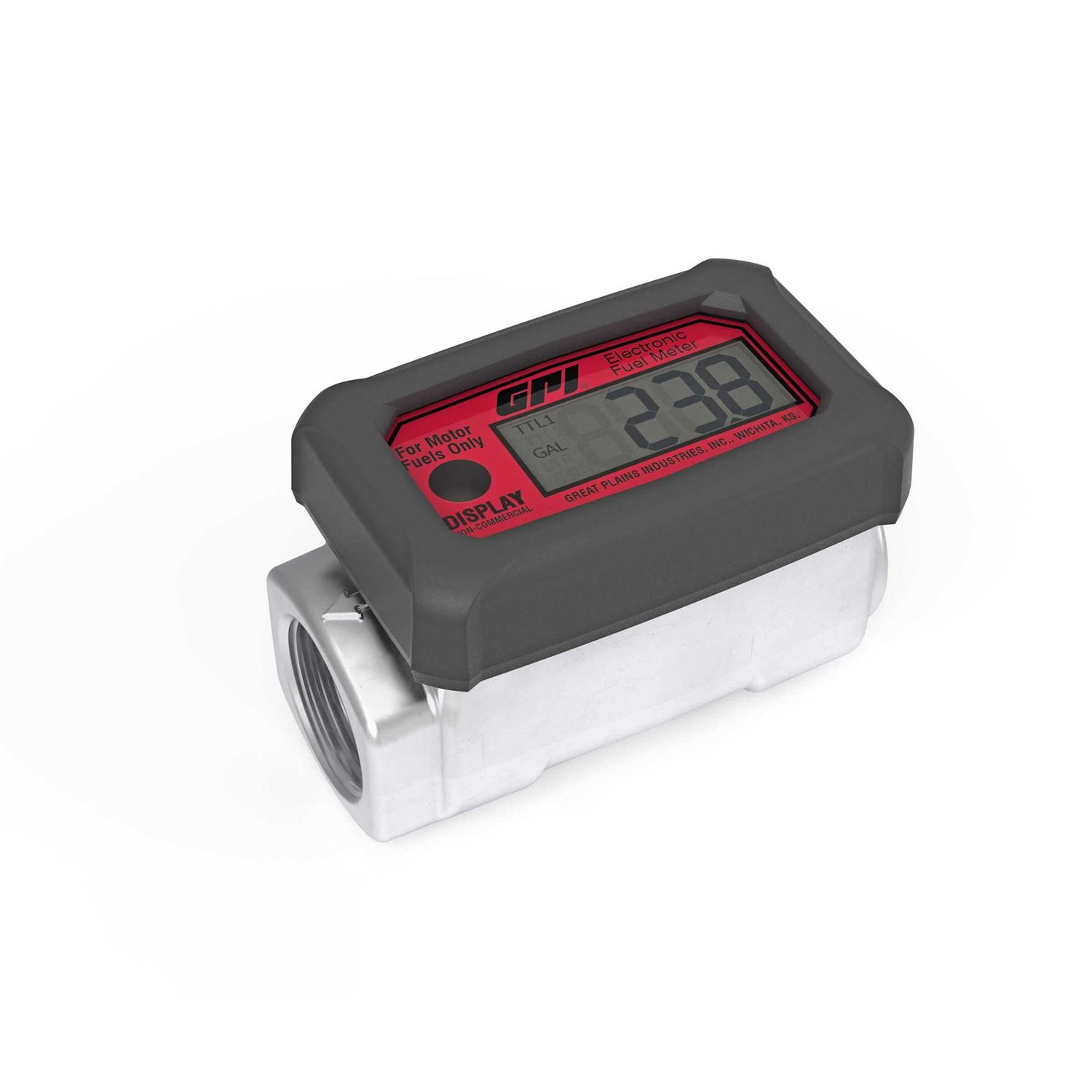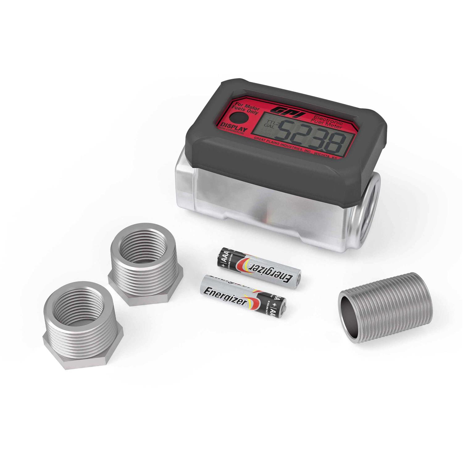 Compact and lightweight, this meter is designed for use on a fuel hose for measuring of pertoleum fuels. It has a flow range of 3 to 30 GPM and has two total readings (accumulative and batch). 1 NPT thread with a 3/4 adapter fittings included. This fuel meter is powered by two AAA batteries (included). The 01A Series meter is for use with gasoline (up to 15% alcohol blends such as E15), diesel fuel (up to 20% biodiesel blends such as B20), biodiesel (B100) and kerosene. Do not use to meter water or chemicals. Do not use for measuring fuel or other liquids into aircraft.
