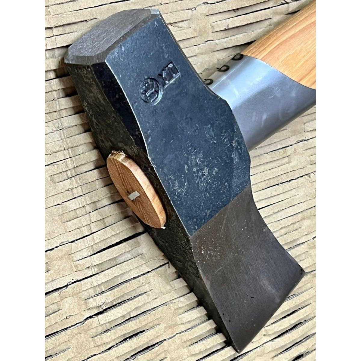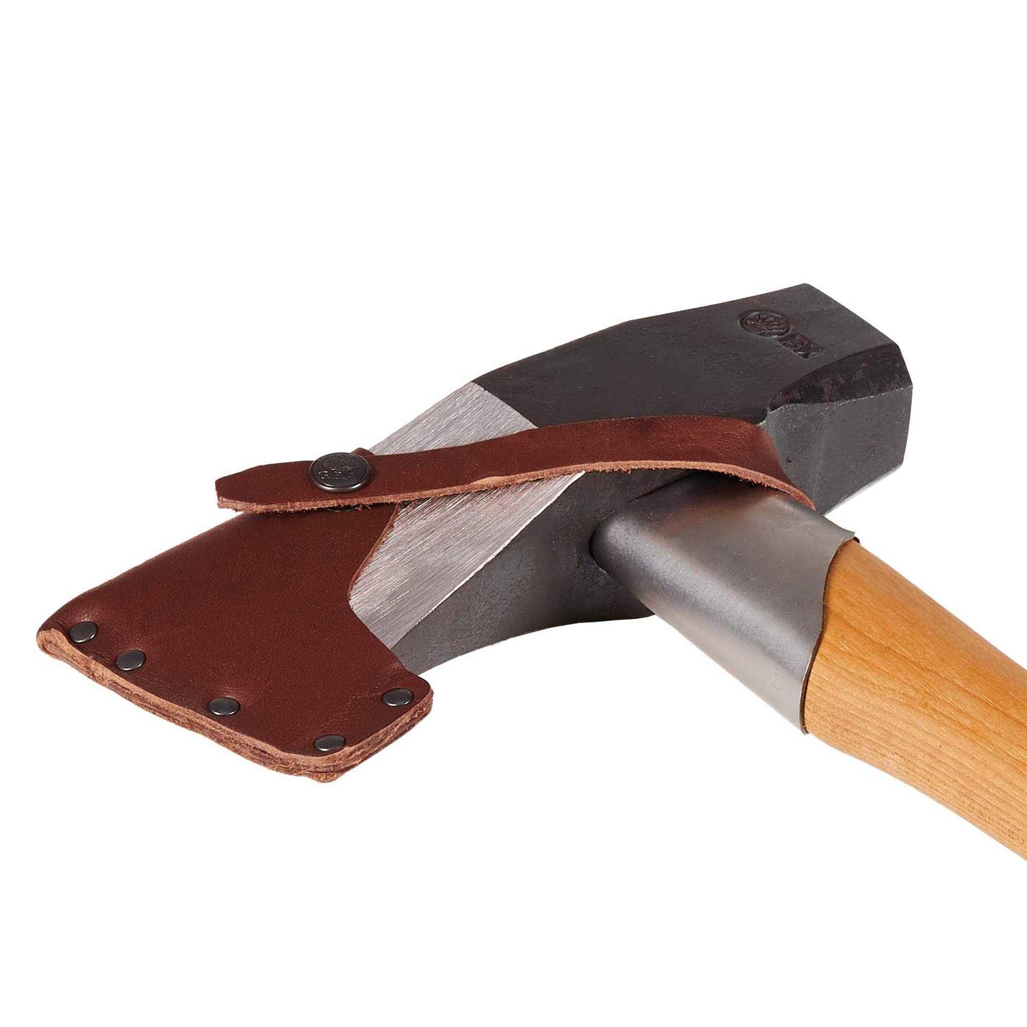 The Grnsfors Splitting Maul can be used for splitting very thick and knotty chunks of wood. It is forged and ground to a concave, quite thin blade at the bit. The axe cuts quickly and easily into the wood and then effectively splits it as the broader section pushes apart the wood. Its weight and sturdy poll with bevelled corners make the maul perfect for striking a wedge. Otherwise, the design is similar to the Larger Splitting Axe, but with a slightly longer poll. The handle has a protective steel collar below the axe head and circular grooves towards the end for an extra firm grip. The Splitting Maul is the heaviest axe produced by Grnsfors Bruk, weighing 7 lb. Overall length with handle is 31.5 inches. A vegetable tanned leather sheath is included.