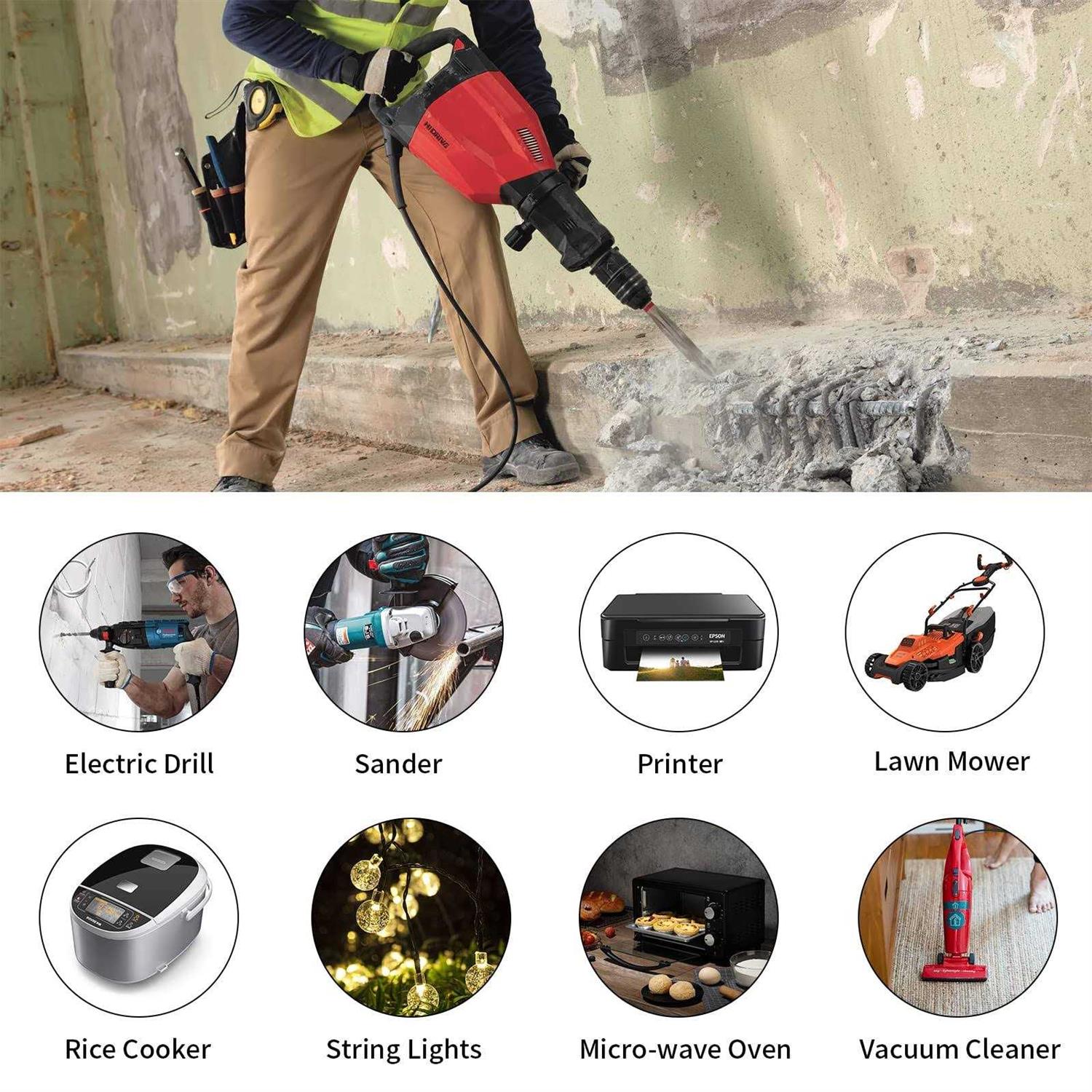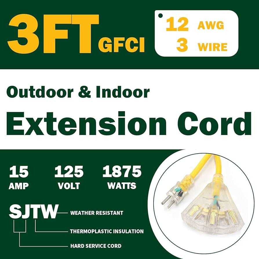 GFCI Protection – Attached GFCI ensures more safety when in use, provide electric shock protection and prevent the risks of electrical fire caused by ground fault; it need to push the reset button to restore the power after interruption,please check your devices before push it to ensure the safety. Lighted Extension Cord End – LED indicator lights up when the cord is powered to let you know the GFCI extension cord is ready to use and easy to be found even in the dark. Heavy Duty Cord – Built with all-copper wire, reinforced blades, and double jacketed cords. 12/3 SJTW 15A / 125V / 1875W; This power cord splitter is suitable for temperatures from -40°F to 140°F. Corrosion, fire and moisture resistant. 3 Outlets in 1 – Multi plug extension cord comes with a pigtail triple tap; allow you to power multiple appliances simultaneously and maximize the usage of power strips and wall outlets. Multi-Purpose Cord – Designed for heavier use, leaf blower, lawn mower, pressure washer, weed whacker, electric drill, power saw, or Christmas holiday lights. Specification: /b br Certification: UL br Covering: PVC material + SJTW thermoplastic br Wire Gauge: 12 AWG with 3 conductors grounded br Amp Rating: 15A max br Voltage Rating: 125V max br Rated Power: 1875 Watts br Use:Indoor / Outdoor br