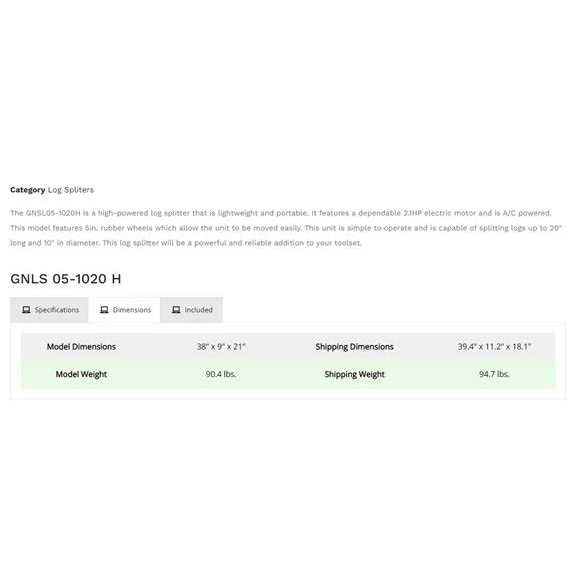 Splits logs up to 20 in. long. Splits logs up to 10 in. in diameter. 120V rated voltage. 1500 Watts motor output. Horizontal splitting type. 20 inch maximum cutting length. 10 inch maximum log diameter.