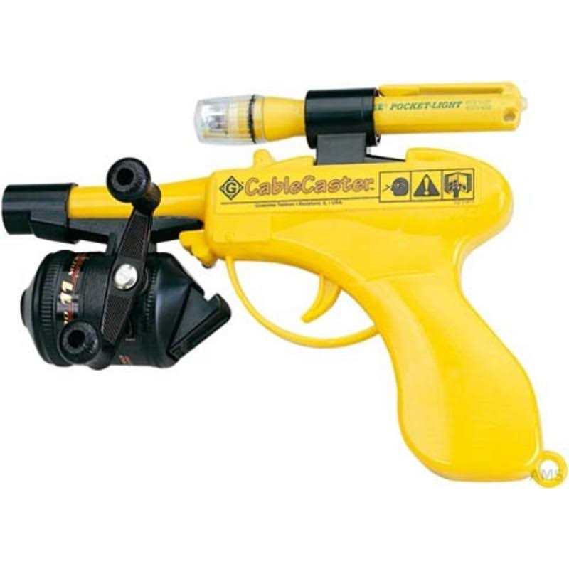Guide Cable Through Hard-to-Reach-Spaces, Useful in Ceilings, Rafters & Sub-Floors, 50′ / 15m Range, Easy-to-Find Bright Yellow Body, Aerodynamic Darts for Improved Accuracy, Glow-in-the-Dark Darts for Easy Location, Optional Flashlight for Added Visibility. Install communications cables faster and with greater control and ease with the yellow CableCaster from Greenlee. This tool is designed for use with suspended ceilings rafters sub-floors and other hard-to-reach spaces. The 50-foot range results in fewer pulls and greater productivity. The bright yellow CableCaster body is easy to find and also helps remind workers to take it with them when the job’s completed. Darts are aerodynamic for improved accuracy and glow-in-the dark for easy location. An optional flashlight provides added visibility.