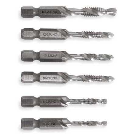 This GREENLEE Drill/Tap Kit provides tradesmen with a variety of drill tap bit sizes for their power drilling/tapping needs. These bits have a serrated design that taps drill holes as you drill them. The bits in this Greenlee high-quality drill tap kit are high-speed steel, which is stronger than carbon steel and lasts longer. You can save time by drilling, tapping, debarring and countersinking all at once with these versatile bits. The bits have a tapered back beyond tap to avoid damage to the thread from over-drilling. These Greenlee high-speed steel drill tap bits have a hex shank which provides a firm connection to the drill chuck. With these bits, you can tap material as strong as 10-gauge metal. A quick change adapter comes with for quickly changing bits. This versatile set has 6 different bit sizes which range from 6-32 NC to 1/4-20 NC.