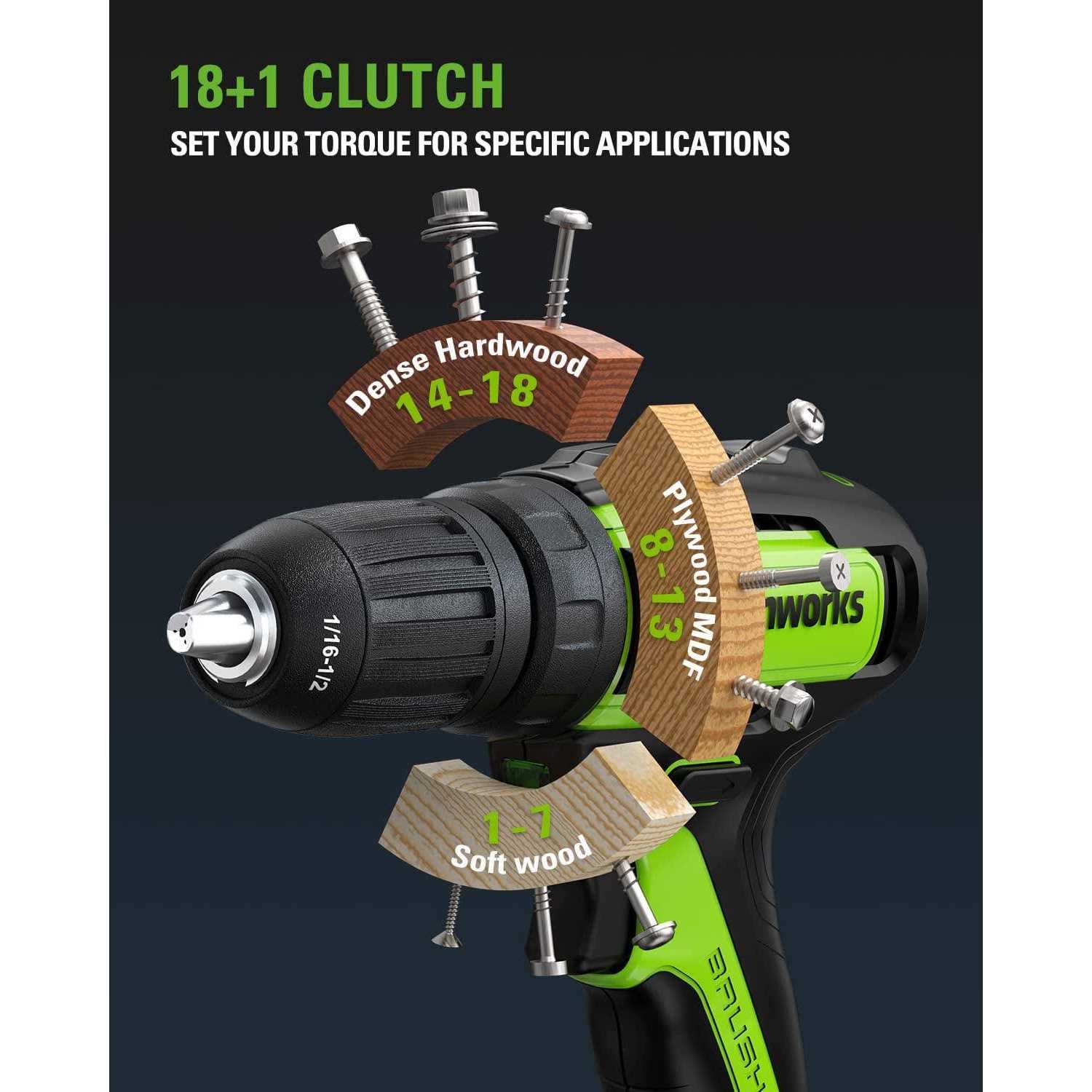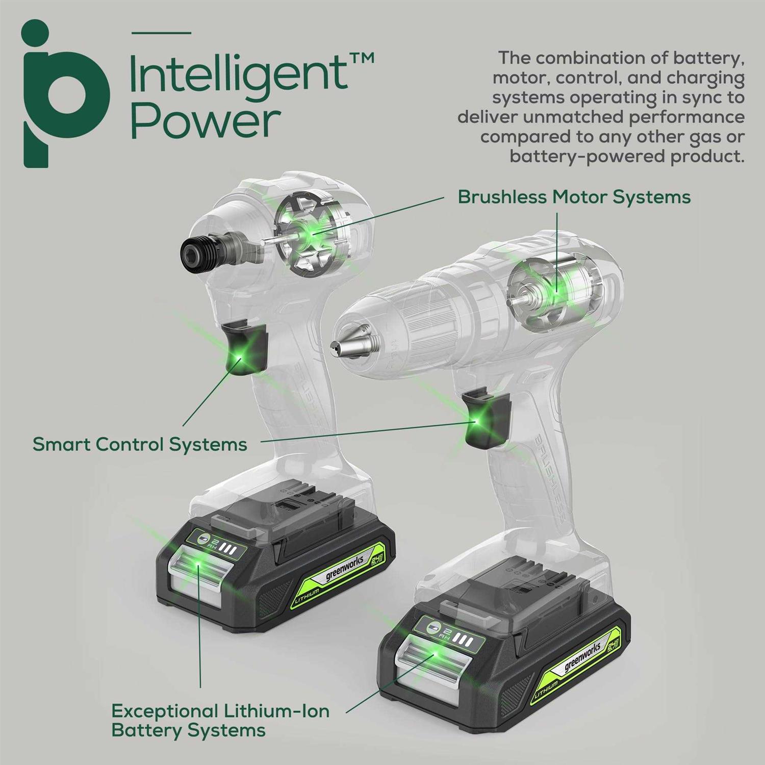 The Greenworks 24V BL Drill / Impact Driver with Two 2AH Batteries and Charger features an 24V high-efficiency brushless motor with push-button start provides more power, torque and longer life. The Greenworks 24V lithium-ion platform powers over 50 indoor and outdoor products, including lawn mowers, blowers, string trimmers, chainsaws, power tools, and more! The 24V lithium-ion battery provides 20% more power and 35% more run-time, and delivers fade-free power with no memory loss after charging. The outdoor power equipment allows you to tackle up to 1/4 acre with the available 1.5Ah, 2Ah, and 4Ah batteries. USB ports are integrated into the BAG711, BAG708, and BAG709 batteries, making it a portable charger for phones, tablets, and other compatible electronic accessories.
