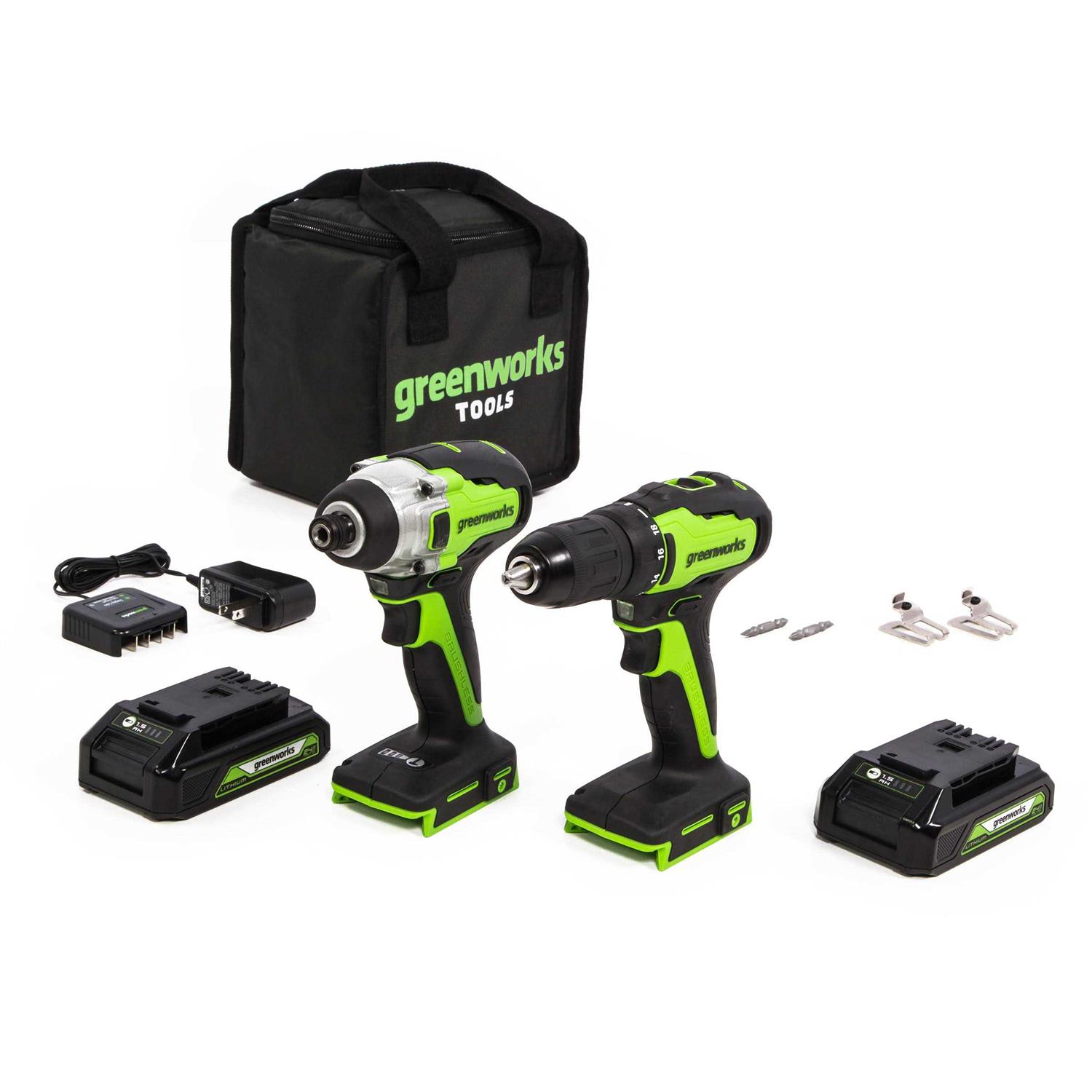 Greenworks 24V Max Cordless Brushless Drill + Impact Combo Kit, 2.0Ah Batteries, Charger, and Bag Included