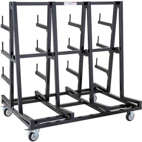 T34007 Lumber and Plywood Cart Efficient storage for lumber, plywood, drywall, and long materials. Are you tired of struggling to organize and store your plywood, drywall, lumber, and other lengthy materials? The Grizzly T34007 Lumber and Plywood Cart is the versatile solution you’ve been waiting for. Two-in-One Design This innovative cart not only provides a neat storage solution for lumber and long materials but also dedicates half of its space to securely hold sheet goods such as plywood, drywall, and more. Mobility and Convenience This versatile rack not only provides efficient storage but also offers exceptional mobility. With its four heavy-duty casters (two fixed and two locking 5″ swivel casters), you can effortlessly roll it into your workspace when needed and conveniently tuck it away when not in use. Robust Steel Construction Crafted with precision from 18-gauge steel, this rack boasts an all-welded steel construction, including a structural channel frame, base, and arms. This ensures durability and long-lasting performance. Ample Capacity The T34007 Lumber and Plywood Cart can handle a substantial load, with a generous 990-pound capacity spread across its four storage levels and one dedicated sheet goods storage rack. Safety First Each level of the rack features arm stops to prevent your materials from spilling out and creating hazards, ensuring a safe and organized workspace. SPECIFICATIONS: Maximum capacity: 990 lbs. Material: 18-Gauge steel Caster size: 5″ Caster type: two fixed, two swivel with brake Overall dimensions: 59″ W x 43-1/4″ D x 50″ H FEATURES: Stores lumber, sheet goods, and more Convenient mobility for transporting materials Sturdy all-welded steel construction Durable powder-coated finish Get organized and make your workspace safer and more efficient with the Grizzly T34007 Lumber and Plywood Cart – the perfect solution for all your storage needs.