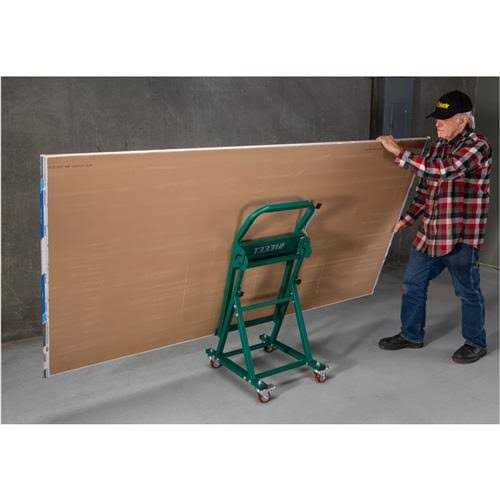 Grizzly T33312 Panel Lifting Cart Easily move and lift heavy plywood panels, sheetrock, and other sheet goods. Transport heavy and awkward sheet goods and tilt them to the height of your workbench, table saw, or wherever you need to move them. The hinged design allows you to easily load panels horizontally from a truck, then tilt them to a vertical position for moving. It’s the next best thing to having an assistant! The heavy tube steel design holds 4′ x 8′ sheets of plywood or drywall with a weight capacity of 300 pounds. Four locking casters allow you to secure the cart while raising or lowering your sheet goods. The T33312 instruction sheets were written by our U.S. based Technical Documentation Department and are packed with useful information. FEATURES: Tilting frame for horizontal and vertical positioning Adjustable height with lock knob Locking swivel casters for securing the cart Heavy-duty tube-steel framing 300-pound capacity Tilting frame for horizontal and vertical positioning Adjustable height with lock knob Locking swivel casters for securing the cart Heavy-duty tube-steel framing 300-pound capacity