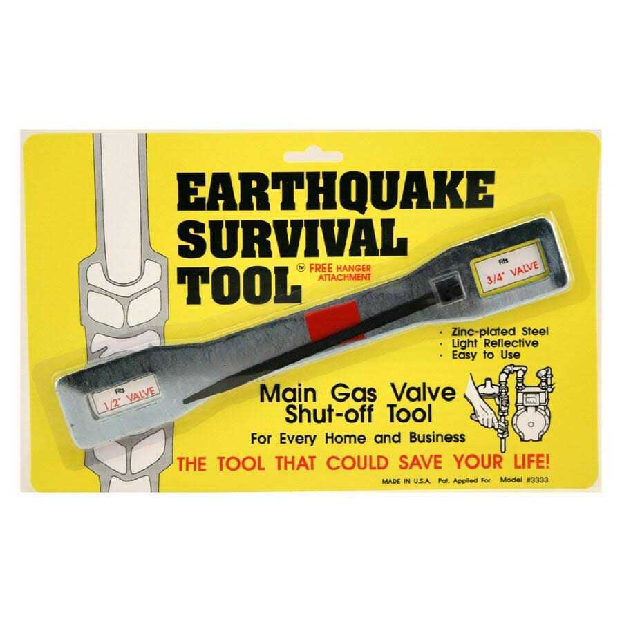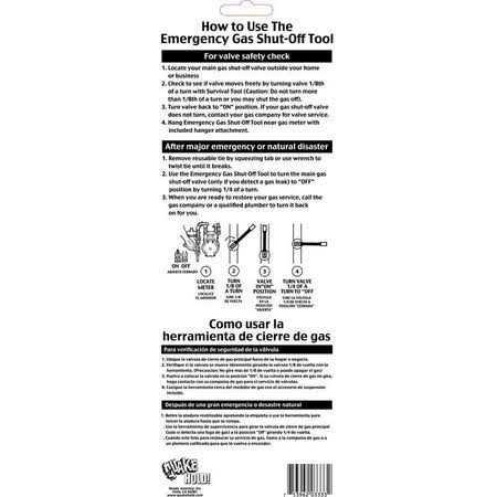 When you encounter an emergency like an earthquake or gas leak in your home shuting off your natural gas can be a prudent move that saves lives. This emergency gas shut off tool will help you get that done. Zinc-plated steel tool made in the USA. Comes with light reflective tape for easy location at night and a zip tie to hang near gas meter. Fits 1/2″ and 3/4″ valves and is easy to use. To shut off gas apply tool to valve and turn 1/4 of a turn. When ready to restore gas supply contact the gas company or a qualified plumber.