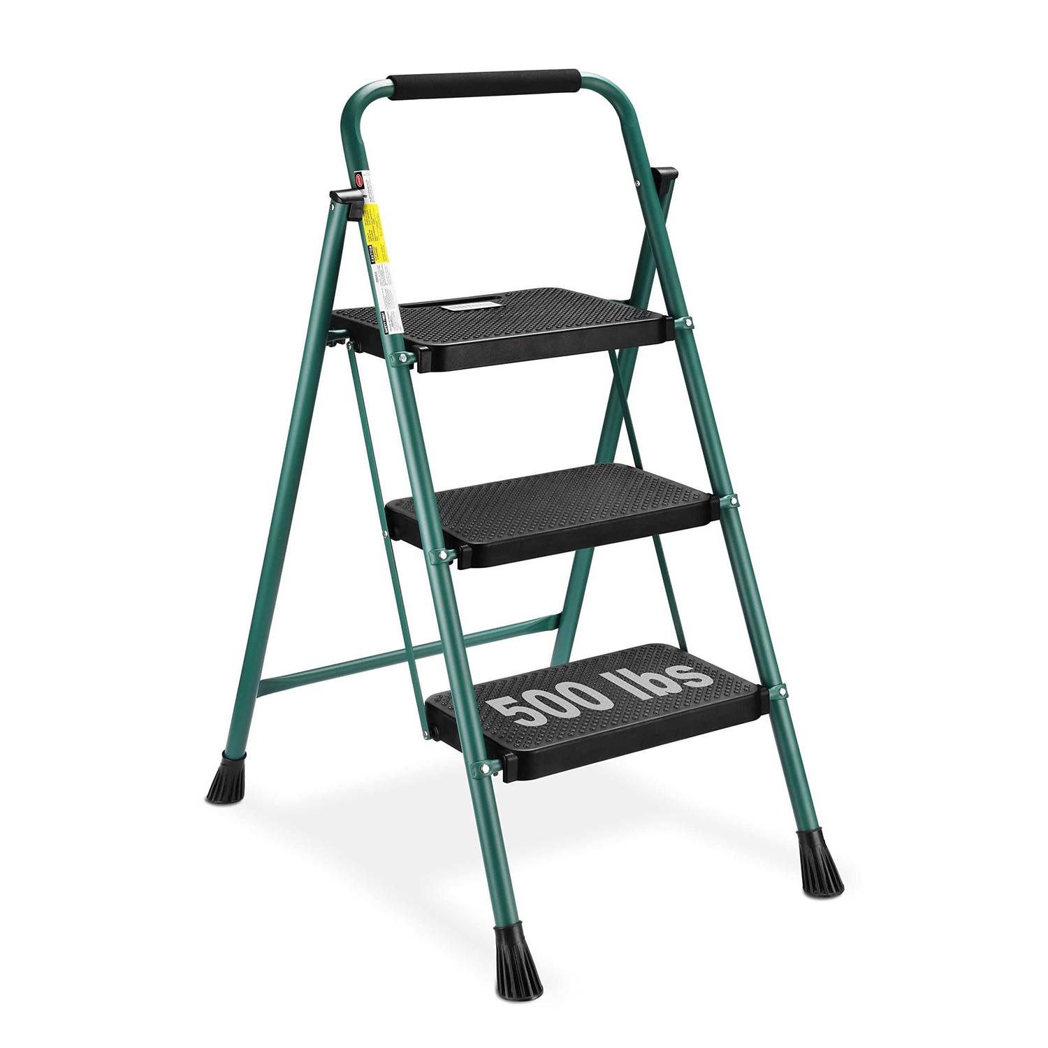 HBTower 3 Step Ladder, Folding Step Stool with Wide Anti-Slip Pedal, 500 lbs Sturdy Steel Ladder, Convenient Handgrip, Lightweight