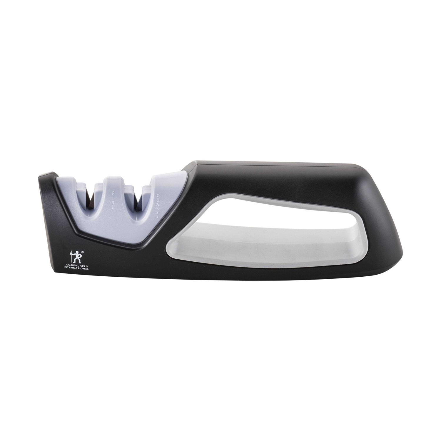 The handy J.A. Henckels International Handheld Knife Sharpener offers a simple solution to knife care. Featuring both coarse and fine ceramic grits, you can maintain the sharp edge of your blade in one innovative tool. Labeled for easy use, the sharpener has an easy-to-hold handle that is contoured for comfort.Suitable for both left- and right-handed use, safety features include a unique grip that keeps fingers away from the knife blade and a non-slip rubberized bottom for stability. With this handheld knife sharpener, caring for your knives has never been easier. And longer-lasting knives make for happier home chefs.Henckels International makes essential kitchen tools that every home chef needs. Each product offers high quality at an exceptional value. Created in 1895 by Zwilling J.A. Henckels, this value-driven brand guarantees the same durability, design and ease of use for which the global company is known. Equip your kitchen with expertise with Henckels International.