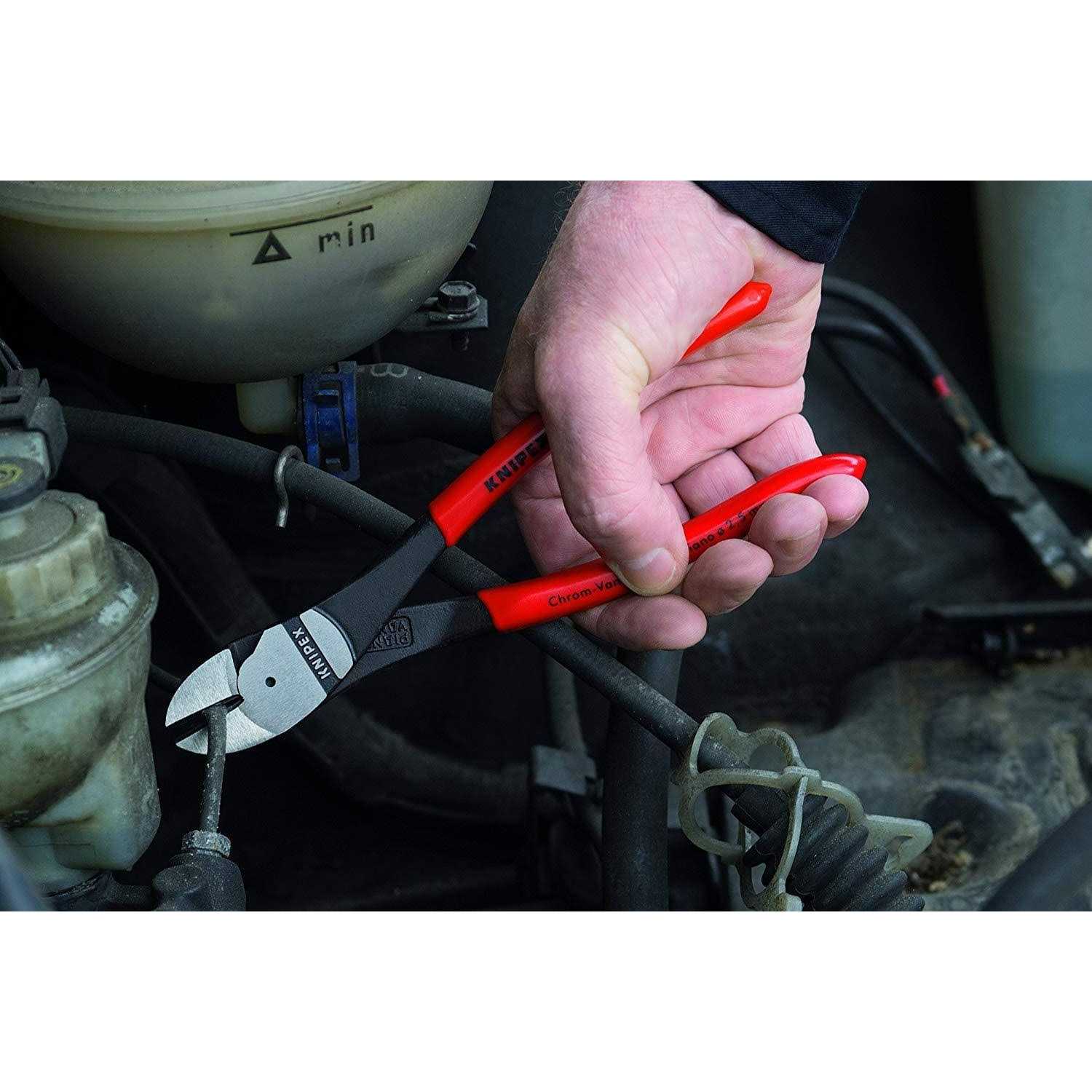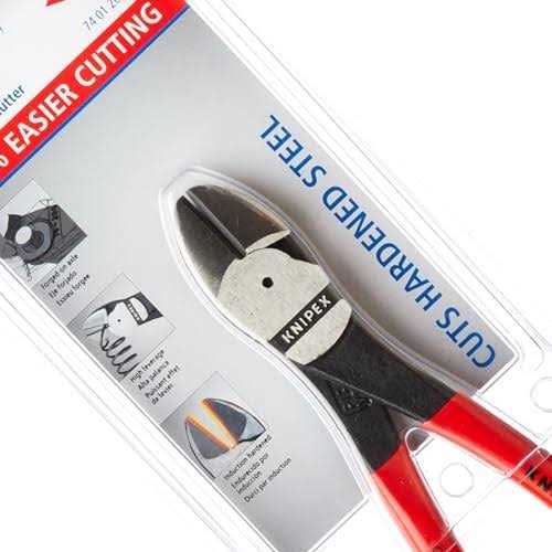 Thanks to their high cutting capacity and indestructible strength, the Knipex 74 01 200 high leverage diagonal cutters are highly valued especially by craftsmen, and therefore in great demand. These high leverage diagonal cutters are also often used in the motor trade, on the building site and in industry. They are also ideal as constant companion in mobile applications, because despite their compact size, they are still able to cut hard materials effortlessly. At just 200 mm long, the Knipex 74 01 200 fits in most work bags and in almost any tool case. Compared to conventional diagonal cutters of the same size, the Knipex 74 01 200 offers a much better ratio between the force required and cutting capacity. The geometry of the cutting edges, joint and the handles has been designed for efficiency. This tool is also the first choice for hard constant use, e.g. during assembly work, because its ergonomic design really conserves the strength of the user. The benefits of these high leverage diagonal cutters do not lie solely in their cutting capacity, but are also plain to feel and see due to the hand-friendly shape of the handle. These high leverage diagonal cutters are extremely stable due to their robust design with forged joint axle, yet quite light, weighing just 263 g.