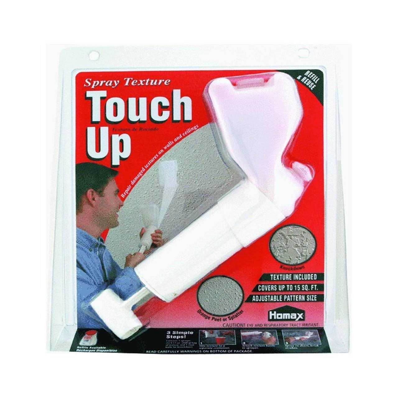 Homax Wall & Ceiling Touch Up Sprayer is a reusable hand-operated sprayer is perfect for small repairs to damaged textured walls and ceilings. Sprayer adjusts to disperse a variety of interior texture patterns including orange peel, splatter and knockdown and popcorn ceiling texture. Wall texture covers up to 15 sq. ft. Ceiling acoustic covers up to 2 sq. ft.