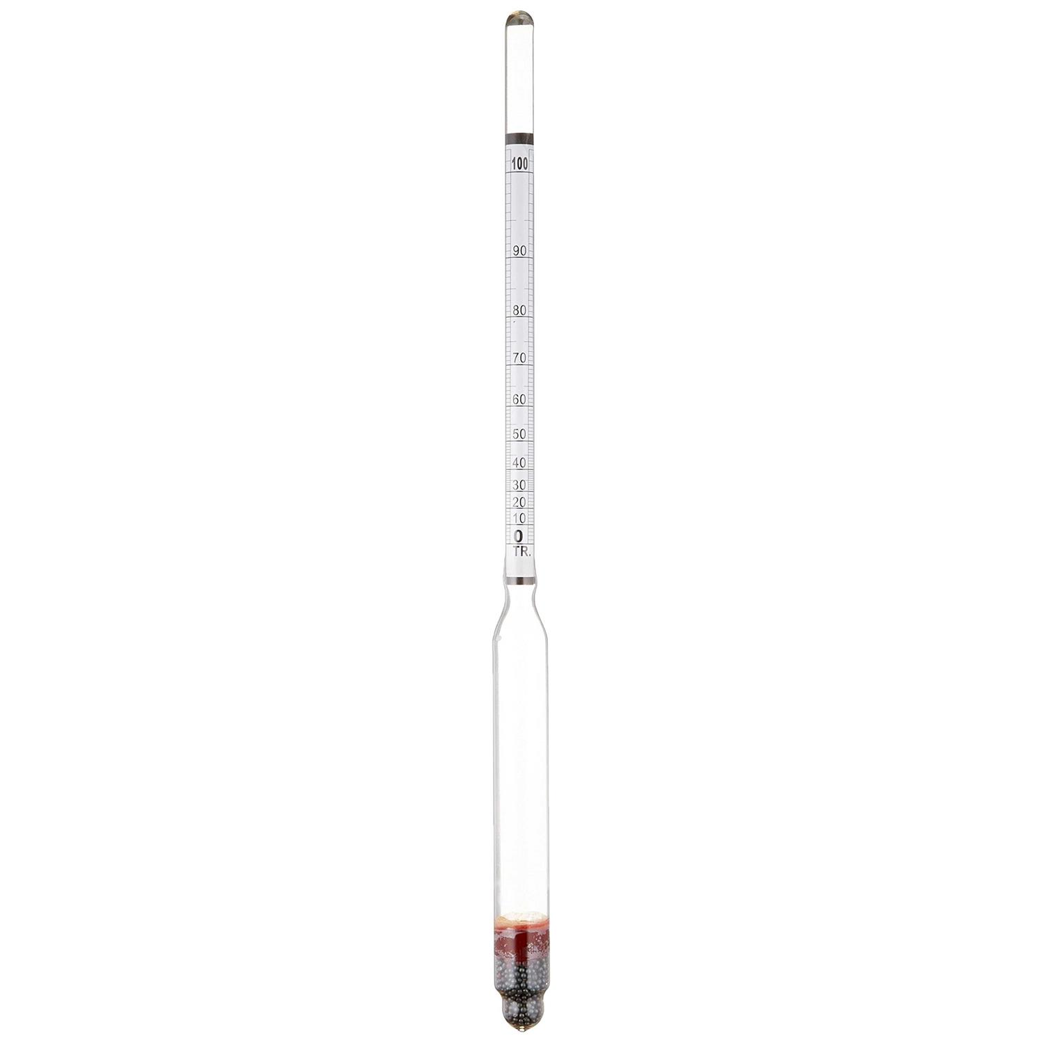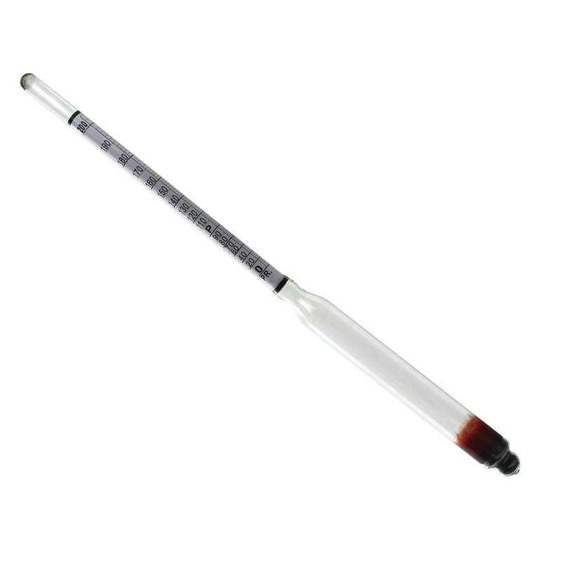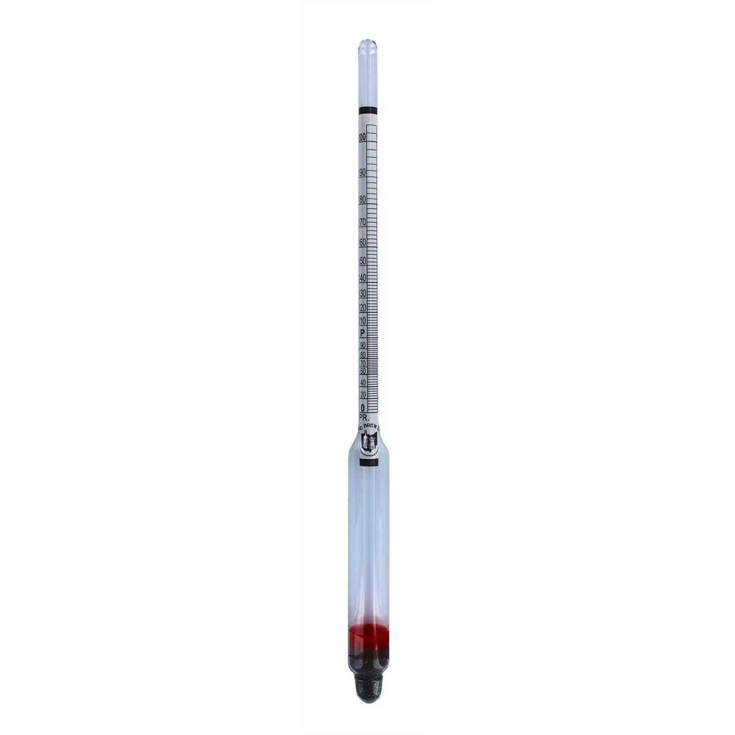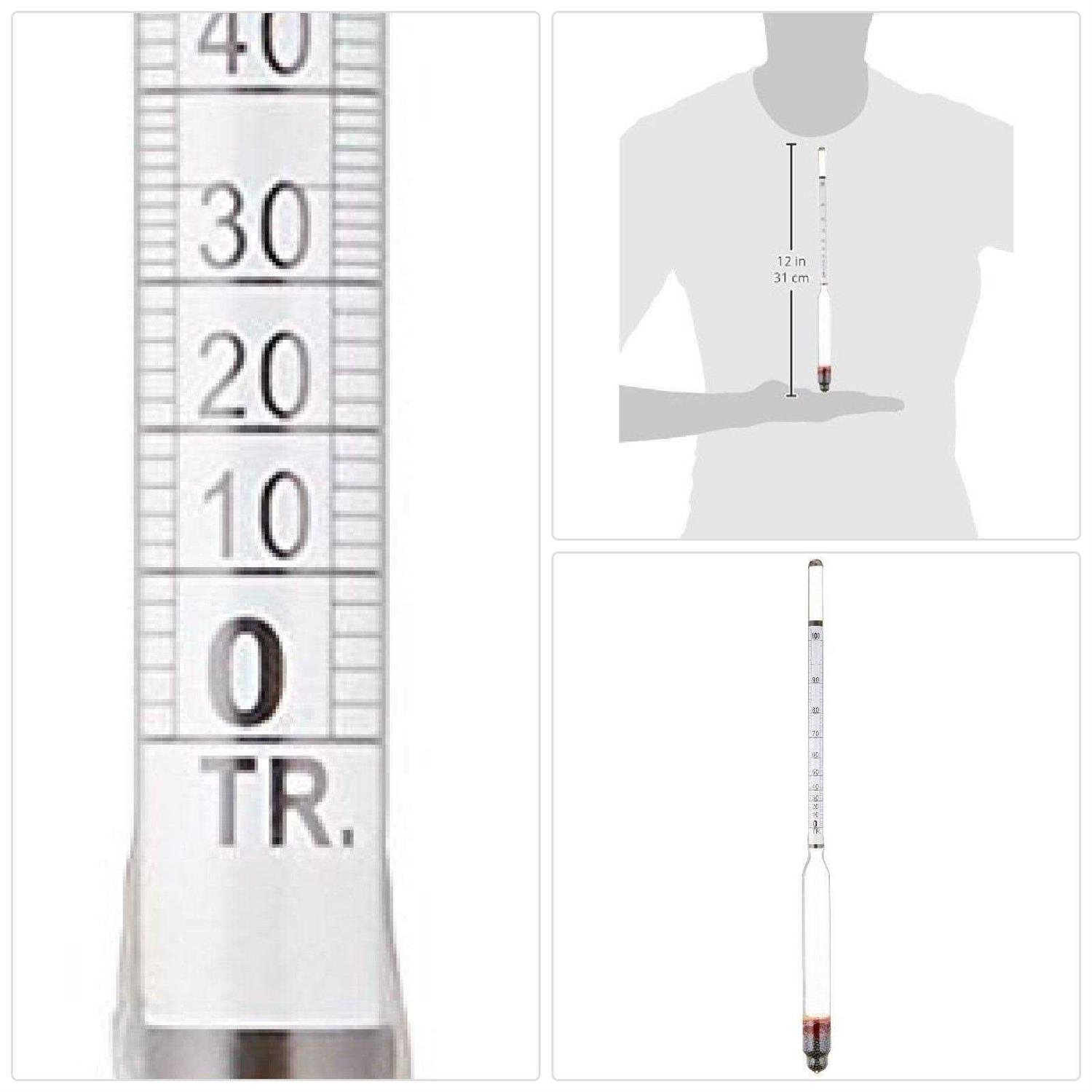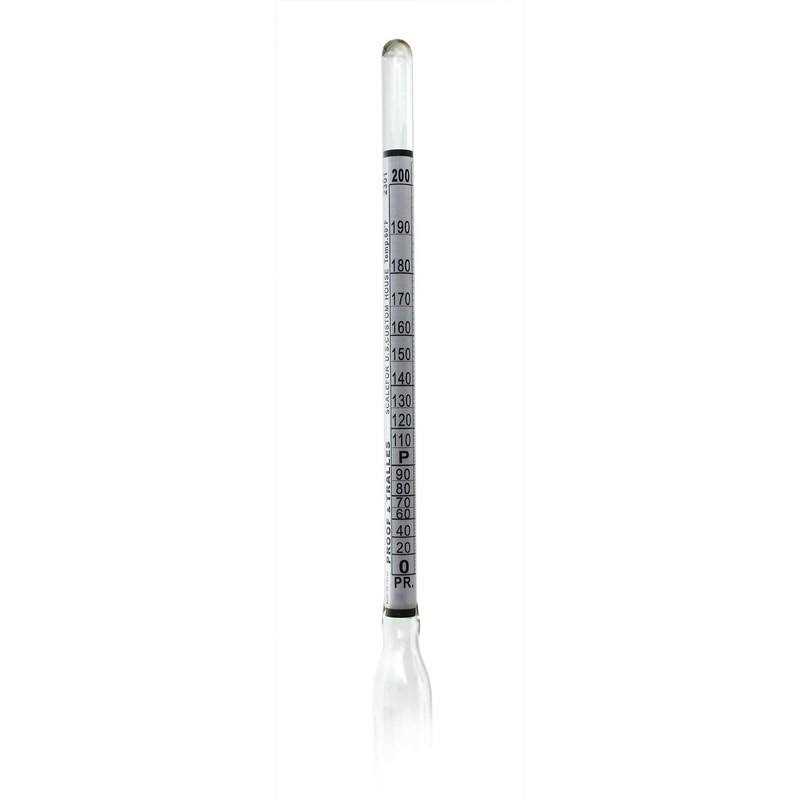 Hydrometer, alcohol, thrilled and proof scales, bellwether, standard temperature 60F, accuracy is a one subdivision, thrilled range 0 to 100%, subdivision tolerance: 1%/ a 1%, proof range 0 to 200% subdivision tolerance: 2%/ a 2%, length 285 mm. Not accurate for lower alcohol products like beer or wine.