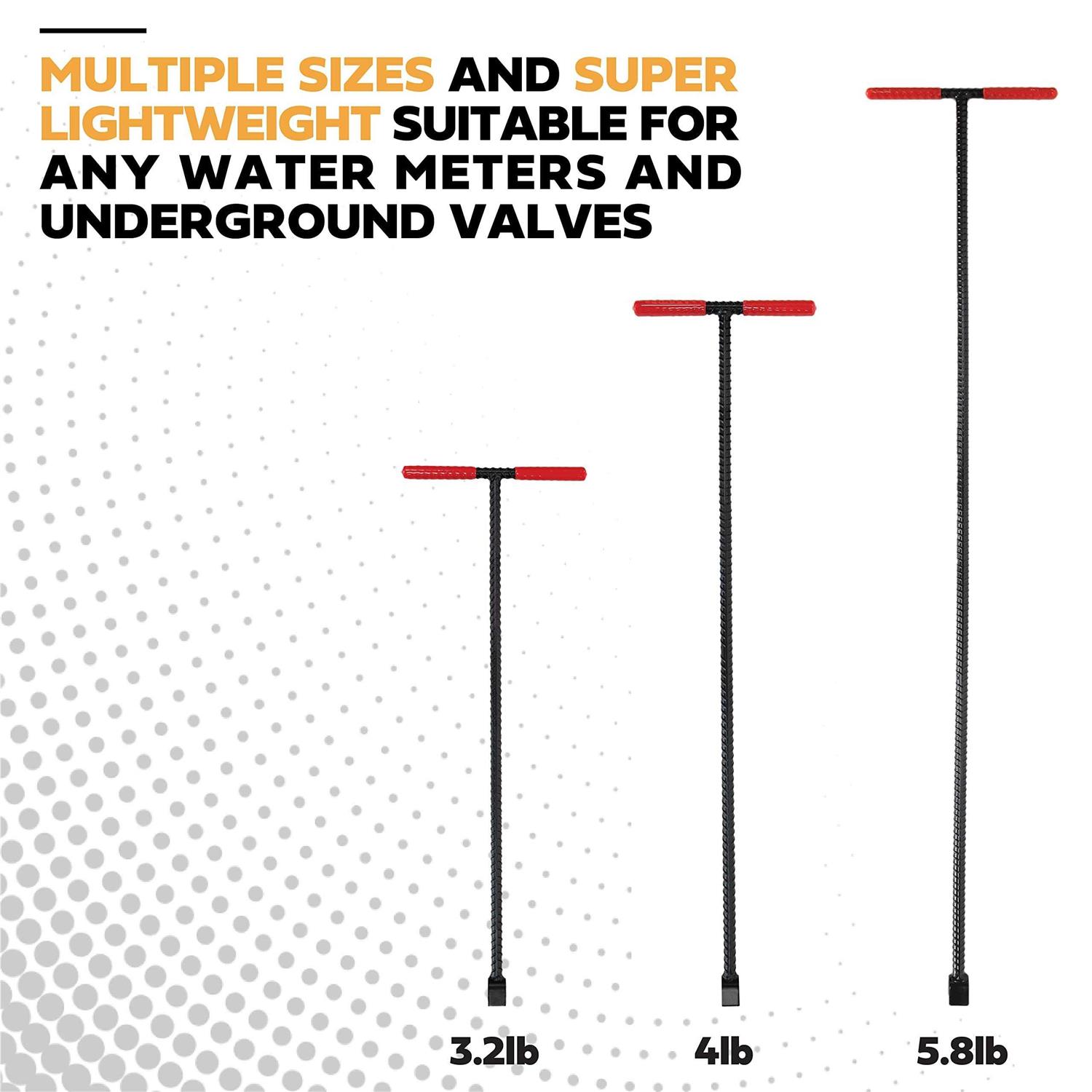 Multitools by HOMESTEAD. Details:This water meter valve wrench turns on and off the main water supply valve for a house or building, also known as curb keys, has a long shaft and a T-handle that allows access for opening and closing hard-to-reach meters or valves. Suitable for use with meters and underground valves such as waste and stop valves. Size available: 28 in, 36in, and 60 in (5 ft).