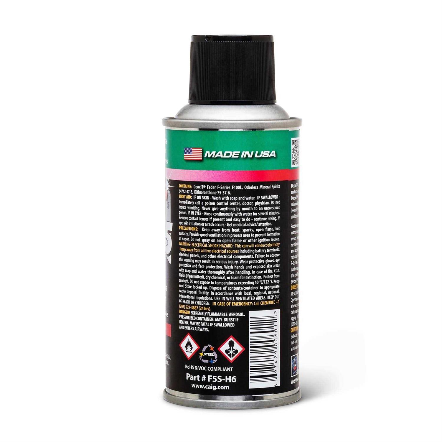 TheHosa F5S-H6 CAIG DeoxIT FaderLube 5% Spray, 5 oz is a precision lubricant designed for use on conductive plastic and carbon compound controls. It is also ideal for use on conductive membrane switches and components.