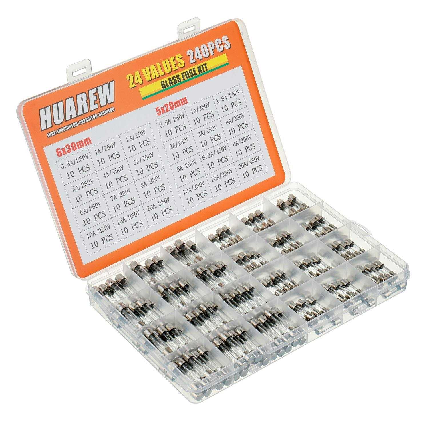 Huarew 24 Values 240 Pcs Fast Blow Glass Fuses 250 V Volt 5×20 mm 0.5 1 1.6 2 3 4 5 6.3 8 10 15 20 A 6×30 mm 0.5 1 2 3 4 5 6 7 8 10 15 20 A amp