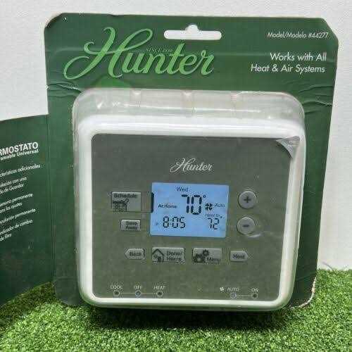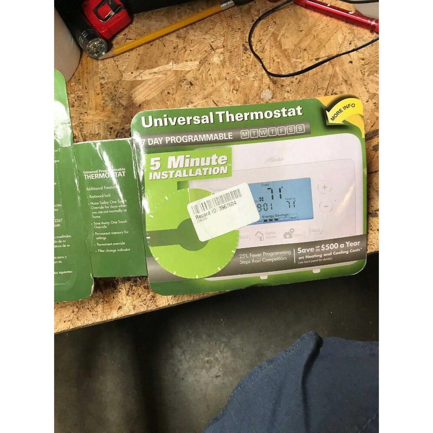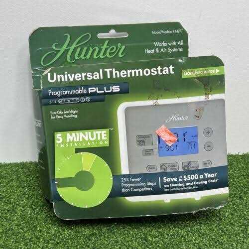 Hunter Universal 7-Day Programmable Thermostat is compatible with most furnaces and cooling systems and specially designed to install easily in 5 minutes. Convenient 7-day programming capabilities. Save Away and Home Today one-touch override features. An energy guide provides you with instant feedback on energy savings as settings are changed. The high-contrast LED backlit digital screen makes it easier to read and program temperatures throughout the home. Uses 2 AA batteries, not included.