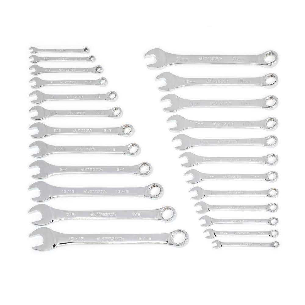 The SAE/MM Combination Wrench Set includes 24 combination wrenches in packaging that doubles as a storage rack. The storage rack allows you to neatly place these wrenches in your storage drawer/chest for easy organization. Husky combination wrenches are forged from Chrome Alloy steel for outstanding durability and strength for a lifetime of use. Each wrench as an open-end for access to fasteners in tight spaces and a 12-point box-end to get a secure grip on fasteners when added torque is needed. No toolbox or workshop of the DIYer or professional would be complete without a this set of combination wrenches from Husky.