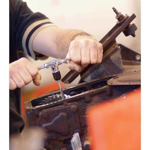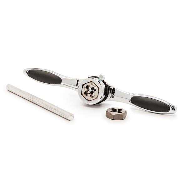 Husky has taken the ratcheting wrench design and applied it to the tap and die application. The ratcheting handles and adapters allow for easy back-and-forth movement that’s required while cutting threads on either taps or dies. The 5-degree ratcheting arc with reversing lever eliminates hand-over-hand turning of the T-handle wrench. The hex die adapters work on either round or hex-shaped dies.