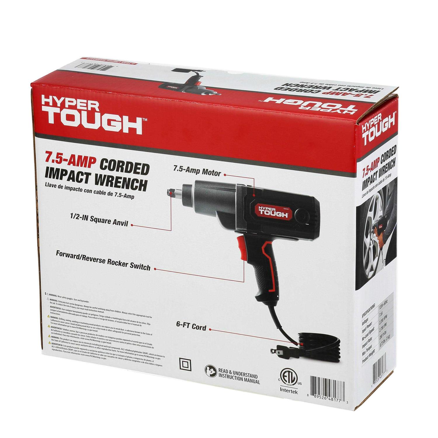The New Black Hyper Tough 7.5A Impact Wrench is rugged and durable and delivers plenty of power without the need for a compressor. When you need some serious torque this 7.5 AMP motor delivers up to 600 ft. lbs. of max torque with a max breakaway torque of 280 ft. lbs. Built with a cast aluminum nose for durability, the lightweight high impact housing on this electric impact wrench means less user fatigue. When you are ready to tackle those home projects Hyper Tough is ready!