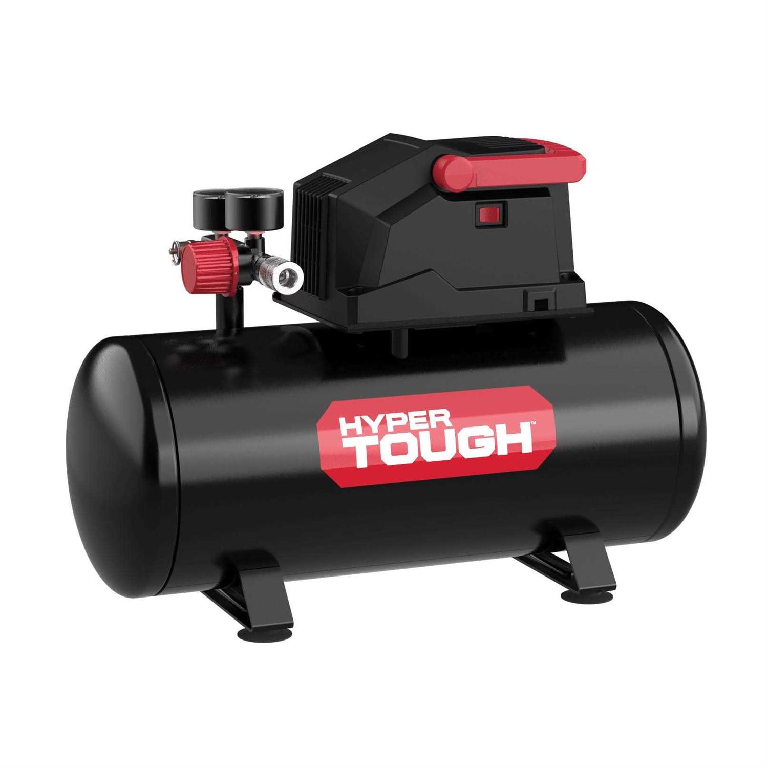 - The Hyper Tough air compressor features two gauges and a large regulator knob for easy operation