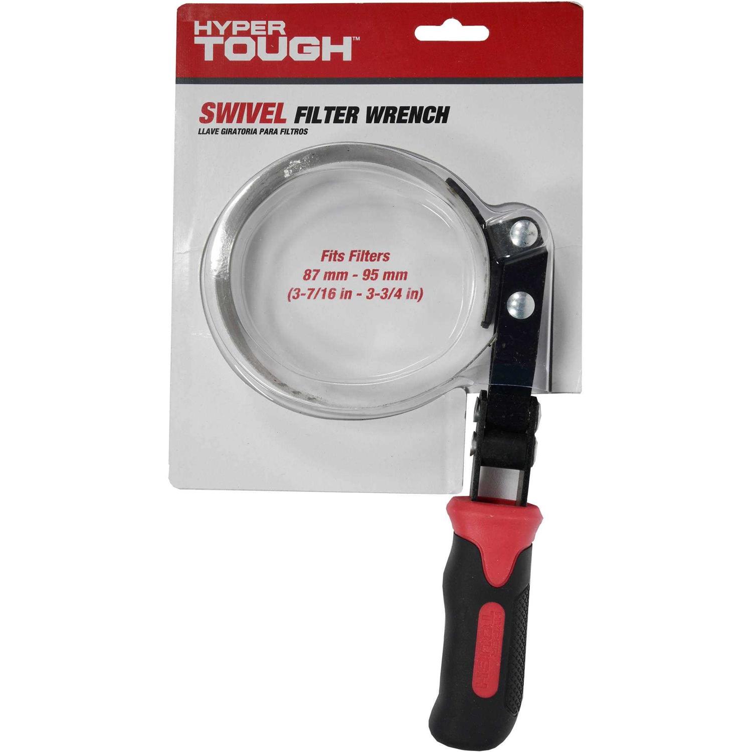 Hyper Tough Swivel Filter Wrench (Model 4202) is great to remove oil filters from 87 millimeters to 95 millimeters in diameter. It features a swivel handle that helps you stay clear of obstructions or anything else that might be in your way and makes it easy to adjust filters in hard-to-reach places. It also features gripper teeth and a wide stainless steel band for better grip on the filters. Condition is new.