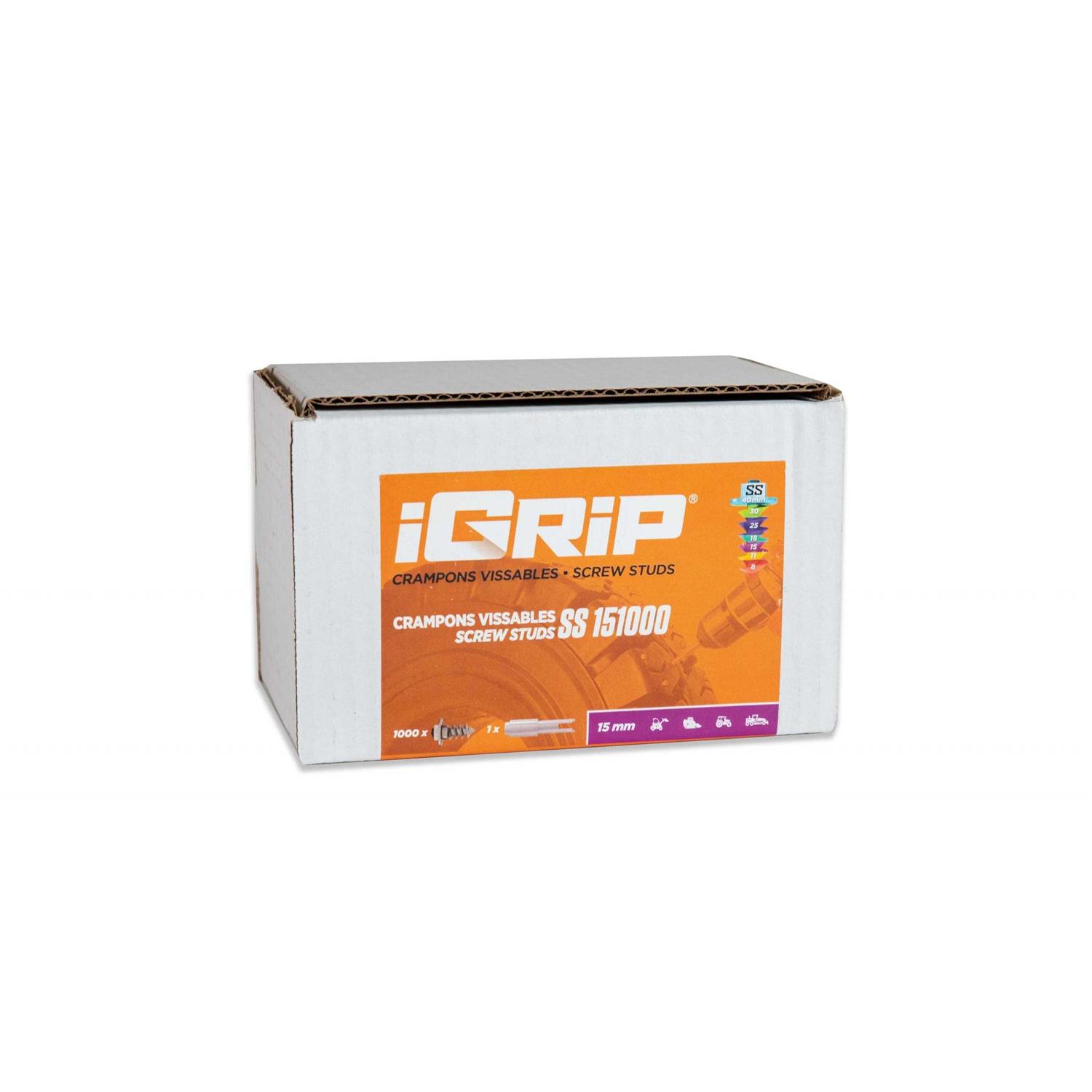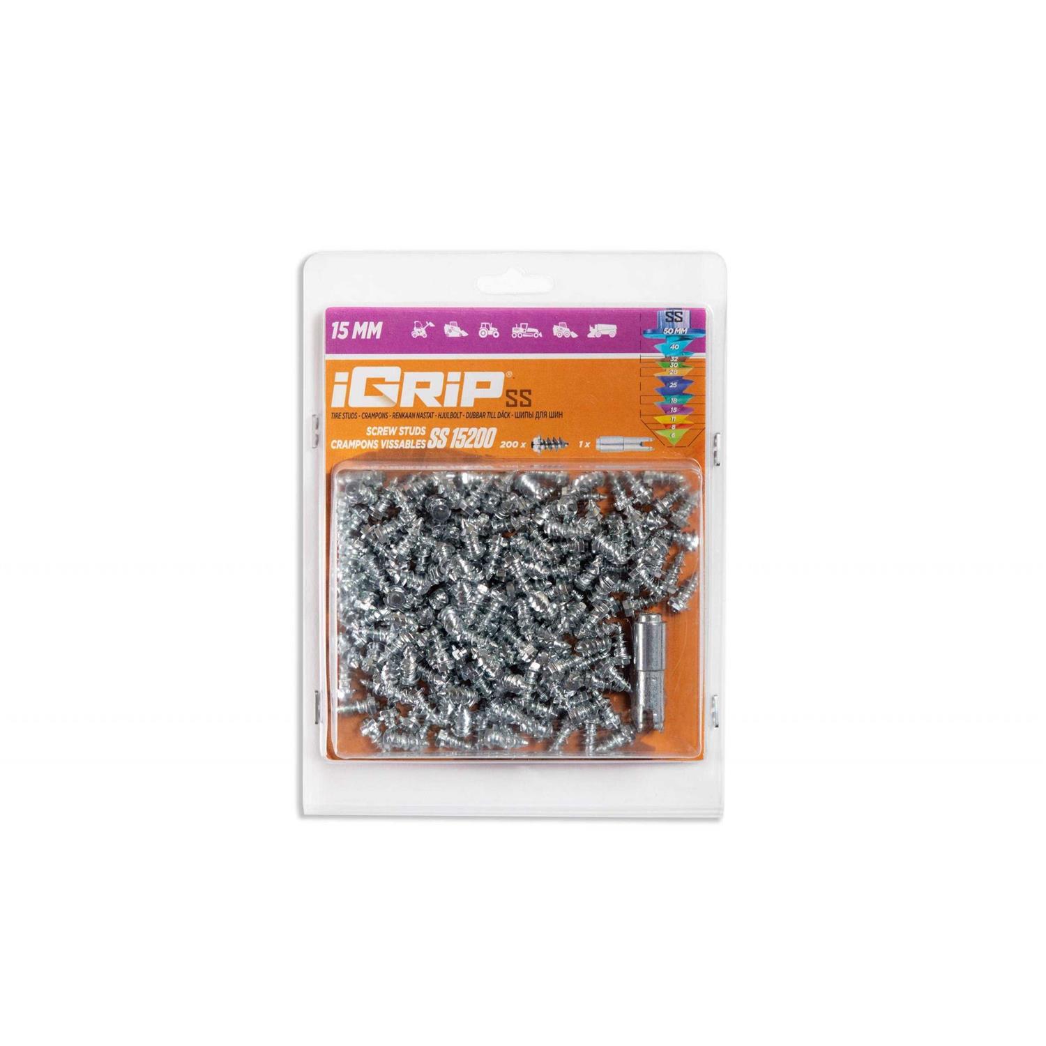 The iGrip tire studs SS151000 are made from hot-dipped steel to maximize durability and thermally galvanized with a zinc coating which acts as a shield against corrosion. A tungsten carbide tip is welded to each stud to amplify continuous traction. This is possible thanks to the exceptional anchoring depth our studs achieve in ice. The structure of this new stud was designed for extreme environments and heavy machinery. The shouldered stud is sure to become a must-have in the mining, forestry and construction industries, for tracked and pneumatic machinery as well as vehicles weighing 100,000 pounds and more. The igrip tire stud SS151000 is 15mm in total length. The recommended minimum tire tread depth is 13mm. The igrip SS151000 are intended for ATV, cross country motorcycle, enduro motorcycle, snow scooter, forklift, small working vehicles such as compact loader, backhoe loader, skidsteer loader and compact tractor. Please note that an installation tool is included in each box.