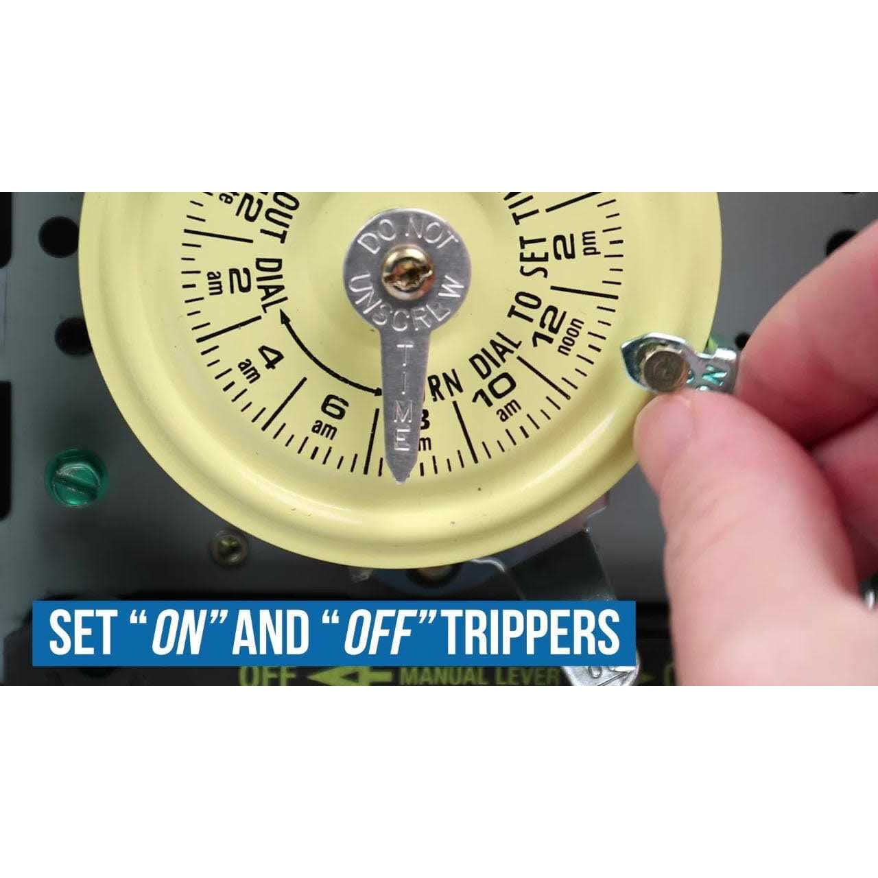 This Intermatic T173 indoor steel case 24-hour dial time switch features three skipper options to omit operation on selected days. Cutout screws are inserted in the dial for days which operation is to be skipped. This time switch provides up to 10 ON/OFF operations each day with minimum ON/OFF operations of 1 hour and maximum ON time of 20 hours. The time switch includes one cutout tripper (also serves as an ‘ON’ tripper), one ‘OFF’ tripper, and three skipping screws.