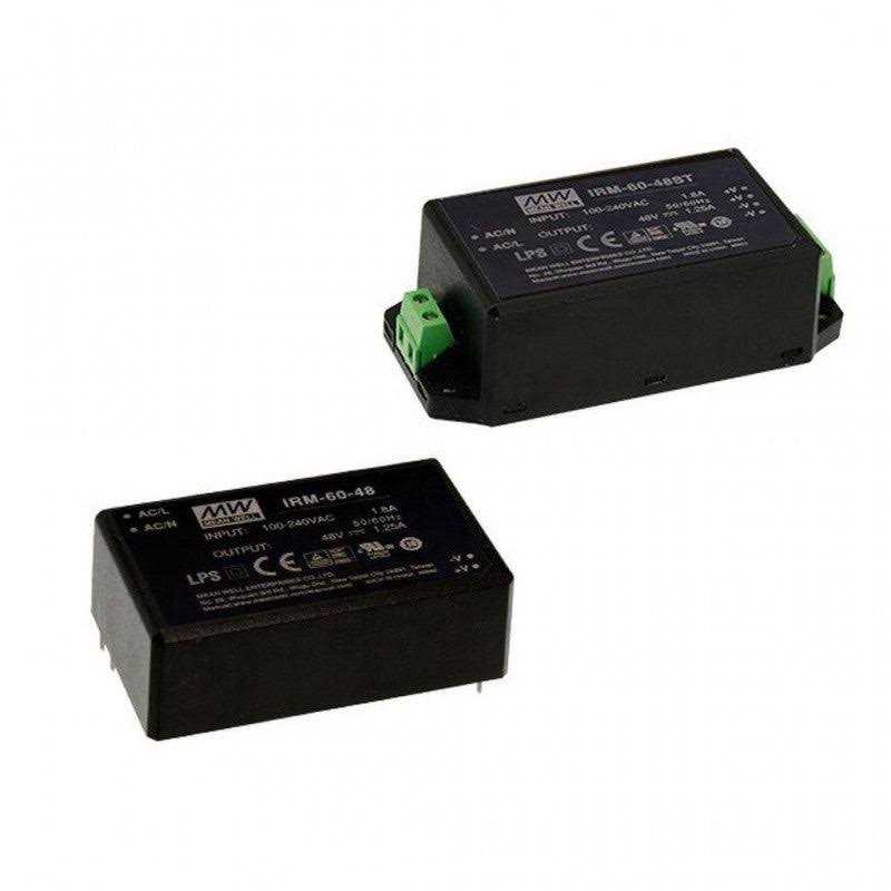 MEAN WELL IRM-60 Series Description: IRM-60 is a 60W miniature power supply (87*52*29.5mm) with AC-DC modular design, which can be soldered on the PCB of various electronic instruments or industrial automation equipment. The power supply allows a universal input voltage range of 85~305VAC. The 94V-0 flameproof housing and fully potted silicone improve heat dissipation and meet vibration resistance requirements of up to 5G. In addition, the enclosure is dust and moisture proof. With high efficiency of up to 91% and ultra-low power consumption of less than 0.15W at idle, the IRM-60 series complies with the global low power consumption guideline for electronics. The entire series meets Class Il requirements (no FGpin) and features integrated EMI filter components, which in turn enable compliance with the EN55032 Class B standard. Thanks to the superior EMC characteristics of the series, the electronic terminals/products are protected from electromagnetic interference. MEAN WELL IRM-60 Series Features: Closed design universal input Power consumption at no load<0.15W Compact size protected against short circuit, overload and overtemperature cooling by free air convection insulation class II Safety standards: UL/EN 62368-1 EMC standards: EN55032 Class B and others IRM-60-: PCB mount IRM-60-ST: Screw terminalsFor detailed technical specifications, please check the data sheet in the "downloads" section.