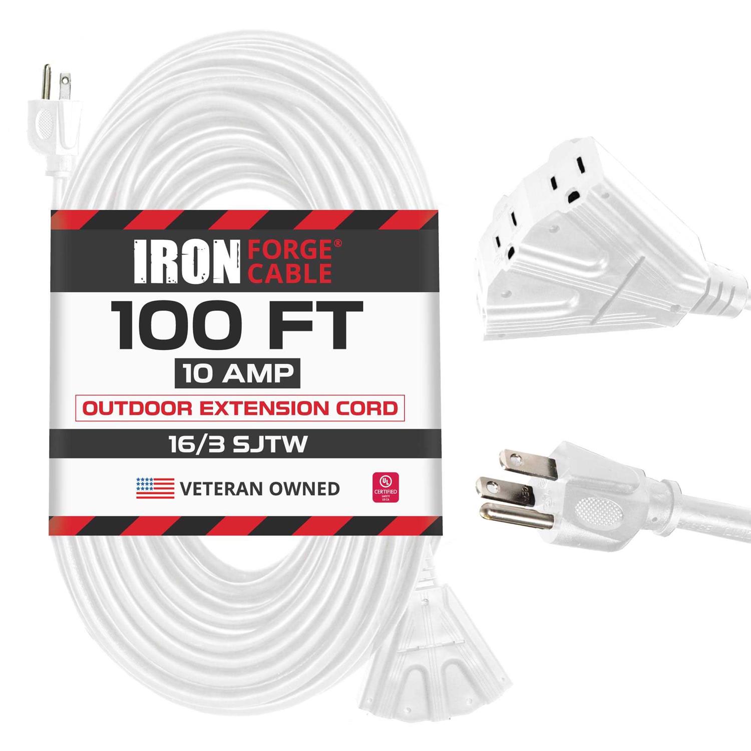 Safe, Efficient Heavy Duty Extension Cord Iron Forge Cables’100 Ft Outdoor Extension Cord is the perfect power cable for all your outdoor electrical needs. It offers durable strain relief for optimal performance, and a 3 prong grounded molded male plug for added safety. The cord’s 100 foot length gives you great reach across your garden. UL Listed. Designed for Outdoor Use Whether you want to power a leaf blower, lawn mower, pressure washer, weed whacker, electric drill, power saw, Christmas decorations, or outdoor Christmas lights, this good quality extension cord is designed to meet all your outdoor needs and hold up well. It’s both water resistant and flame retardant. The vinyl covering protects the cable against abrasion and direct sunlight. The extension cord has a fantail with 3 power outlets so you can run multiple electrical devices simultaneously.