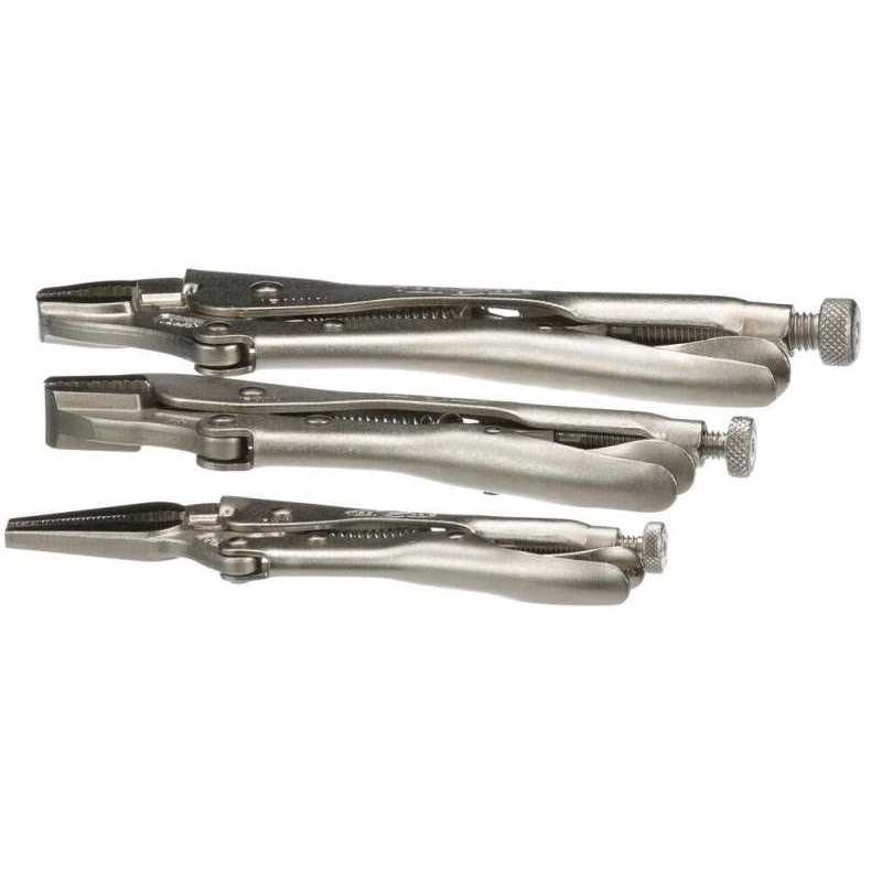 Locking Pliers Set creates sturdy grips on a variety of materials. The included 6-inch long nose pliers have a 2-inch capacity, and the slim nose increases maneuverability with small stock. This Irwin locking pliers set also comes with a 7-inch straight jaw plier, one that has a 1 1/2-inch capacity that tightly grips flat-edged materials. The set includes a 10-inch curved jaw plier as well; it has a 1 7/8-inch capacity for general tightening and loosening tasks. This Vise-Grip locking pliers set features a classic trigger design, which creates maximum pressure on every hold. Alloy steel construction allows these tools to handle serious jobs with minimal damage.