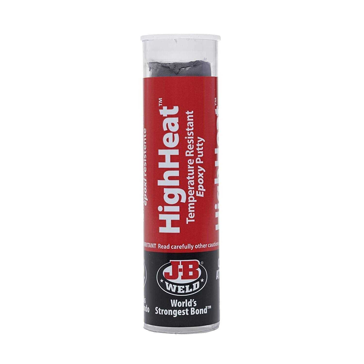 J-B Weld HighHeat is a hand mixable epoxy putty stick specifically formulated to bond and repair materials that will be exposed to high temperatures in automotive and industrial maintenance applications. It cures to a tough, hard bond with little to no shrinkage. This industrial-strength product outperforms conventional epoxy putties at high temperatures and sets in 1 hour at room temperature. After 8 hours, it can be drilled, tapped, machined, ground, filed and painted.HighHeat is rated at a tensile strength of 800 PSI and cures to a machine grey in color. It is able to withstand continuous heat exposure of 400oF and intermittent heat exposure to 550oF.