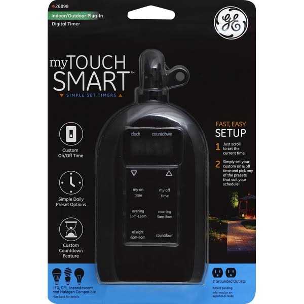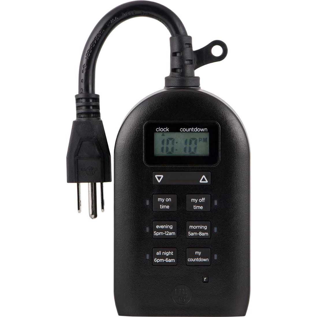 - Easy-to-set digital timer for landscape, patio and seasonal lights and appliances features two grounded outlets.