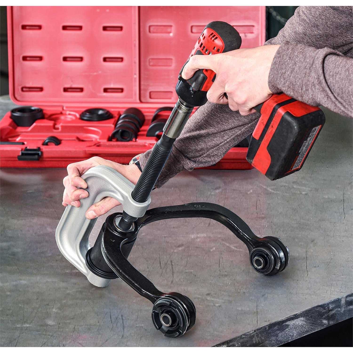 Remove/Install Ball Joints, Brake Pins, and… Construction:… Includes: (1)…- Construction: Steel- Includes:(1) C-Press(1) Short Pin(7) Receiving Tubes(3) Adapters(8) Cups(1) Carry Case Parts Breakdown JEGS 80639Make removing and installing press-fit ball joints, drum brake pins, and u-joints easy with the ball joint service kit from JEGS. With a range of tubes, adapters, and cups, designed to fit with the included c-press, you can complete most jobs in the comfort of your garage.FeaturesRed plastic blow-molded case securely holds each part in its specific location- Designed for press-fit ball joints, will not work with the bolt-in type- Fits 1210 series and larger u-jointsMeasurementsC-PressOpening dimensions: 6 1/8 in. L x 2 1/8 in. DThreaded rod: 9 1/8 in. L x 1.120 in. DBolt head: 7/8 in. Through opening inside diameter: 1.260 in.- Adapters Adapter 1Side 1 dimensions: 1.720 in. D, 2.230 in. D, 2.720 in. D Side 2 dimension: 0.865 in. D (Fits C-press threaded rod)Inside diameter: 0.945 in. Adapter 2Side 1 dimensions: 2.225 in. D, 2.720 in. DSide 2 dimension: 0.865 in. D (Fits C-press threaded rod)Inside diameter: 0.0515 in. Adapter 3Outside diameter: 1.435 in.- Stepped flange diameter: 1.220 in. (Fits C-press bottom opening)Inside diameter: 0.815 in.CupsCup 1:Dimensions: 2 7/8 in. L x 2 in. ODInside diameter: 1.800 in.- Internal depth: 2 3/8 in.- Bottom opening diameter: 0.235 in. Cup 2:Dimensions: 3 5/8 in. L x 2.500 in. ODInside diameter: 2.165 in.- Internal depth: 3 1/8 in.- Stepped flange dimensions: 2.465 in. OD x 1 in…. Remove/Install Ball Joints, Brake Pins, and… Construction:…