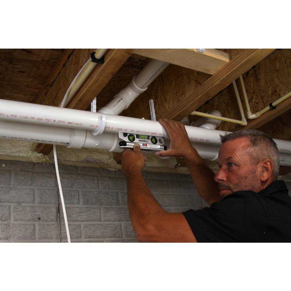 Precision crafted anodized machined aluminum frame for superior accuracy and durability. Four vials read plumb level 45 and cross check. Three 90 beams emit simultaneous level plumb and square reference points. Strong magnetic v-groove base and tripod mount allows for flexible attachment to a variety of surfaces. V-groove aligns unit with pipes. Works with any 1/4 in. 20 tripod. Length : 7.5 Inch. Width : 0.75 Inch. Depth : 2.125 Inch.