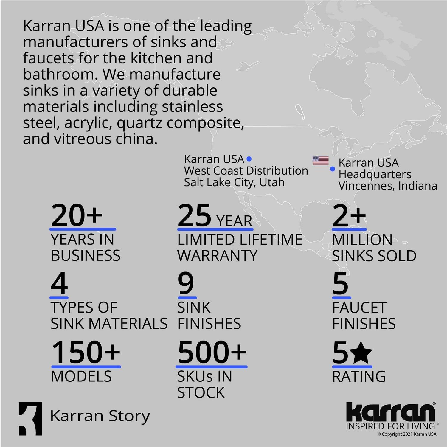 Add style and color to your kitchen. Karran’s quartz sink is the perfect combination of style and durability. Its surface is ultra-hard and its practical yet elegant design is perfect in any of today’s kitchens. This sink is produced from 80% quartz crystals and the finest acrylic resins. The sinks surface is scratch and chip resistant, and will withstand hot pots and pans up to 530 Deg. F. The smooth, non-porous material means food and beverages won’t stick to or stain the surface making clean easy with just a cloth and soapy water. This standard size sink is ideally suited for kitchen remodel projects as well as new kitchen projects. Convenient rear drain placement ensures maximum useable space in sink and cabinet underneath. One faucet hole pre-drilled with additional holes marked on underside.