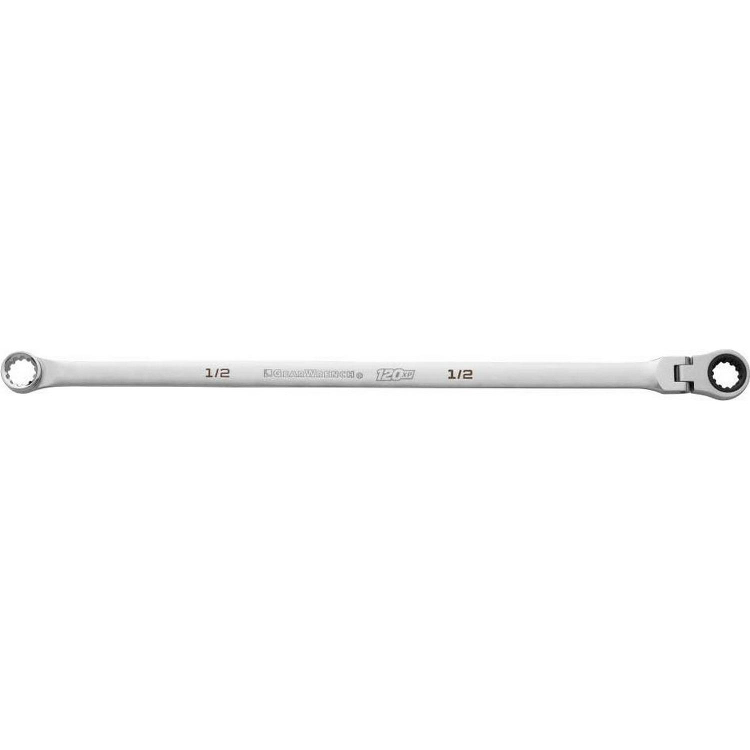 The Gearwrench 120Xp universal spline ratcheting wrenches offer 120 positions and a 3 degree swing arc greatly improving speed, access, and efficiency of every job. The open end of the wrench has a reduced head diameter for greater access and features dual direction off-corner loading which gives a better grip on the fastener and reduces fastener rounding. The XL wrenches are up to 25% longer than our standard ratcheting combination wrenches providing more access and strength to tighten or release the most stubborn fasteners. The wrenches are made from a strong alloy steel with a bright, full polish chrome finish. The sizes are stamped and highly visible on each end of the wrench, metric using blue and SAE using red for quick and easy identification while on the job. The 86142 is a double box GearBox 10 piece SAE set that includes sizes 1/4 in. to 3/4 in. and comes with a V rack for storage and organization.