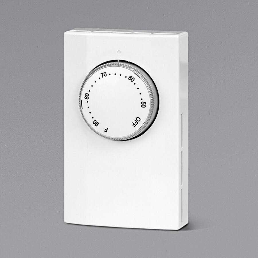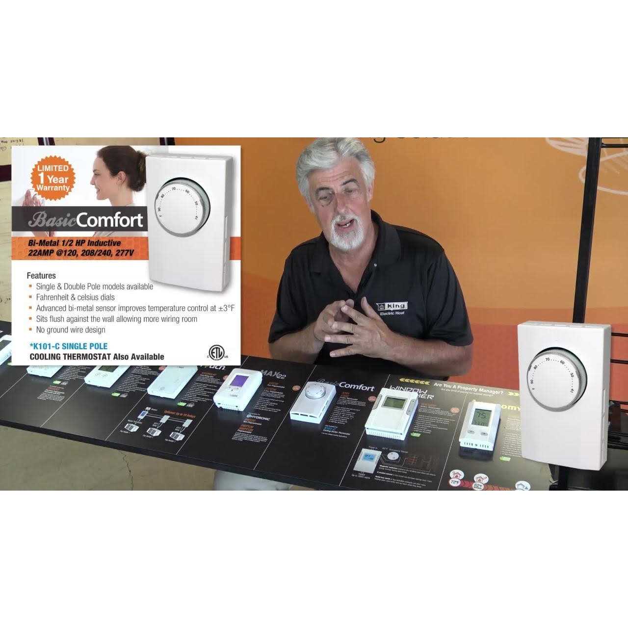 King Electrical 2-Pole Thermostat in white color has a bi-metal sensing element and operates in the range of 41 to 90 deg F. It works with a supply voltage of 120/208/240/277 Volts and is rated at 22 Amps. It has a maximum power rating of 5280 Watts. It has a clean, beveled style that suits any decor and can be flush mounted directly to a 2 Inch x 4 Inch vertical electrical outlet box. It has deg C/deg F control dials and senses air in all directions with a fully vented cover. Wall mountable thermostat is designed for use with line voltage electric heaters. Temperatures are easily adjusted with a large knob with an accuracy of +/- 3 deg F.