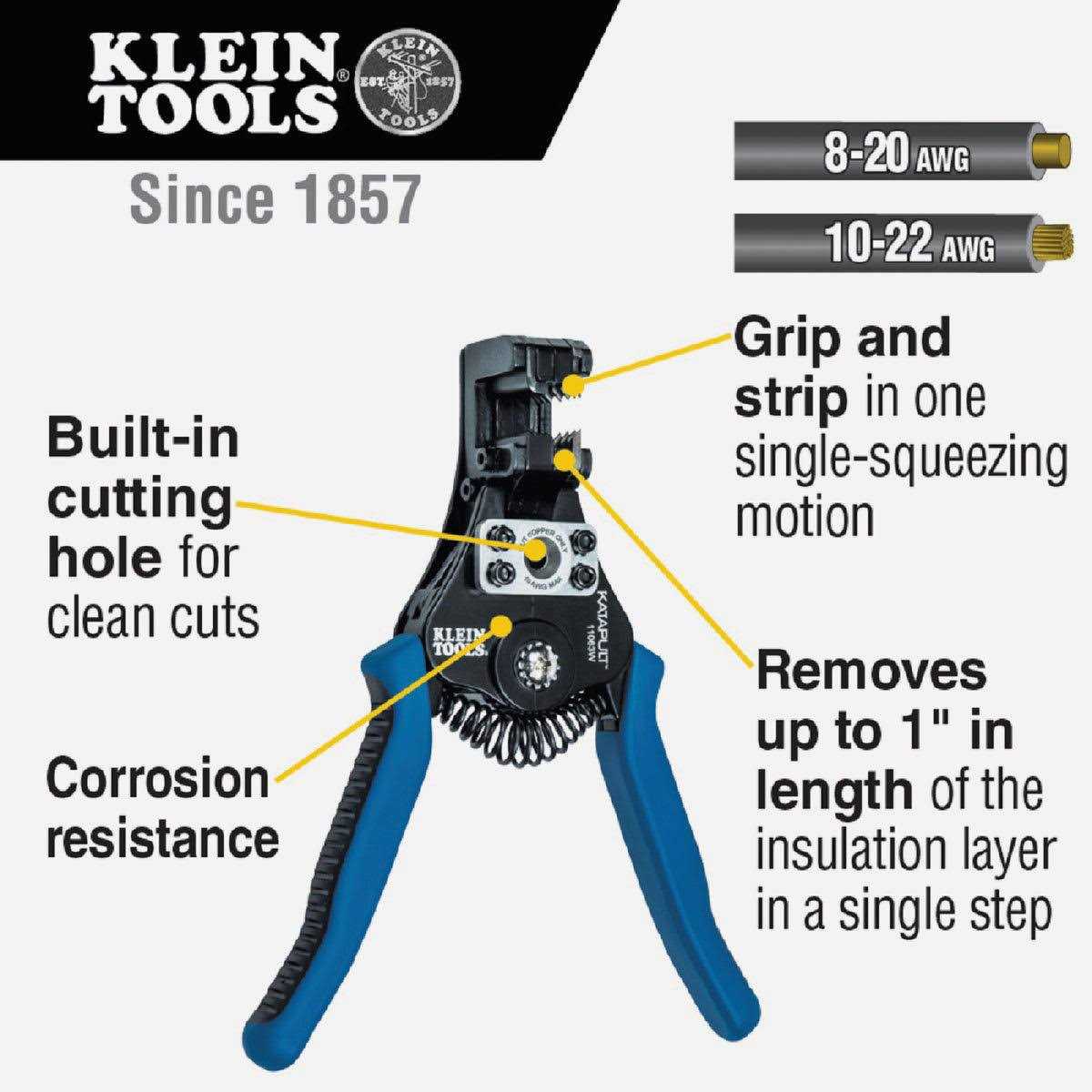 Use the built-in cutting hole to cleanly cut 8-22 AWG wire, while the stripping head allows you to easily grip and strip just by squeezing the handle. The tension loaded wire-grip gently holds the cable in place while retaining the cable geometry. Precision machined stripping holes easily remove the jacket insulation without damaging the wire. Recoil spring design returns tool to ready position upon cycle completion. Cast alloy chassis with heavy-duty Coat finish for corrosion resistance and durability.