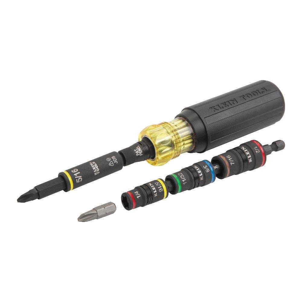 Klein’s 11-in-1 Impact Rated Driver and Flip Socket with a #2 Phillips Bit Set brings a new-to-world design to a classic 11-in-1 screwdriver. Each component is compatible with an impact driver, as well as the included screwdriver handle, eliminating the need to carry separate power tool accessories. Comes with a #2 Phillips bit for added convenience. Multi-purpose Impact Flip Socket features six of the most commonly used hex driver sizes stored on one easy to use blade.