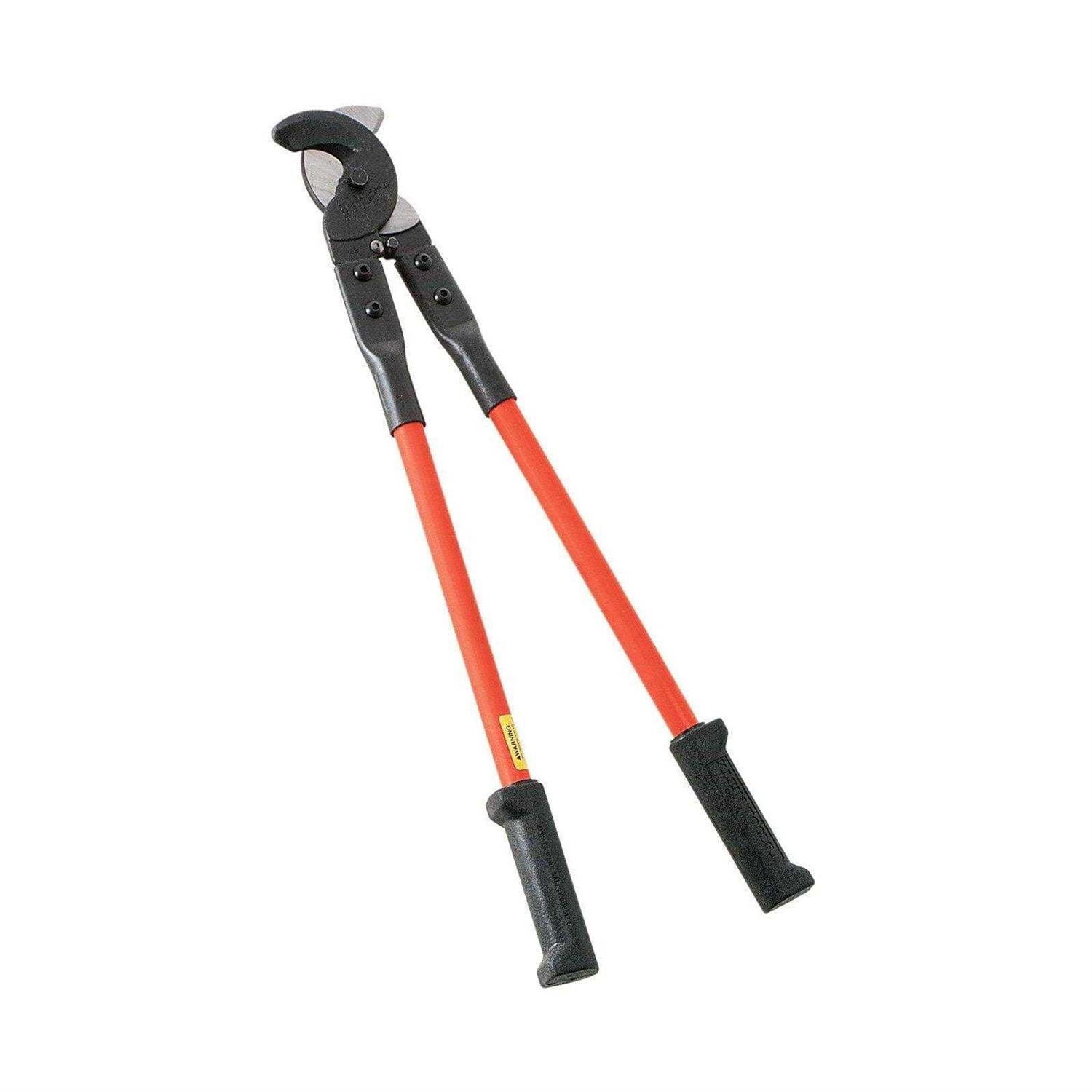 Lightweight, yet efficient shear-type cutting of 1-3/8″ diameter, 500 Cu, and 750 Al Replaceable hook-jaw blades grab and hold cable while shear-cutting action makes clean cuts Exceptionally strong fiberglass handles with heavy vinyl grips for comfort and slip resistance and heavy-duty pins in head that serve as blade-stops Jaws are forged tool steel with black-oxide finish for long life Made in USA Beveled tips assure positive mating, and hinge on a rugged bolt with a pin-set nut to maintain proper blade tension Make a clean, even cut for ease in fitting lugs and terminals Not designed for cutting steel or ACSR Klein Tools Standard Cable Cutters are lightweight, yet efficient. They feature replaceable hook-jaw blades that grab and hold cable while the shear-cutting action makes clean cuts. The jaws are made of forged tool steel with a black-oxide finish for long life. The exceptionally strong fiberglass handles have heavy vinyl grips for added comfort and slip resistance.