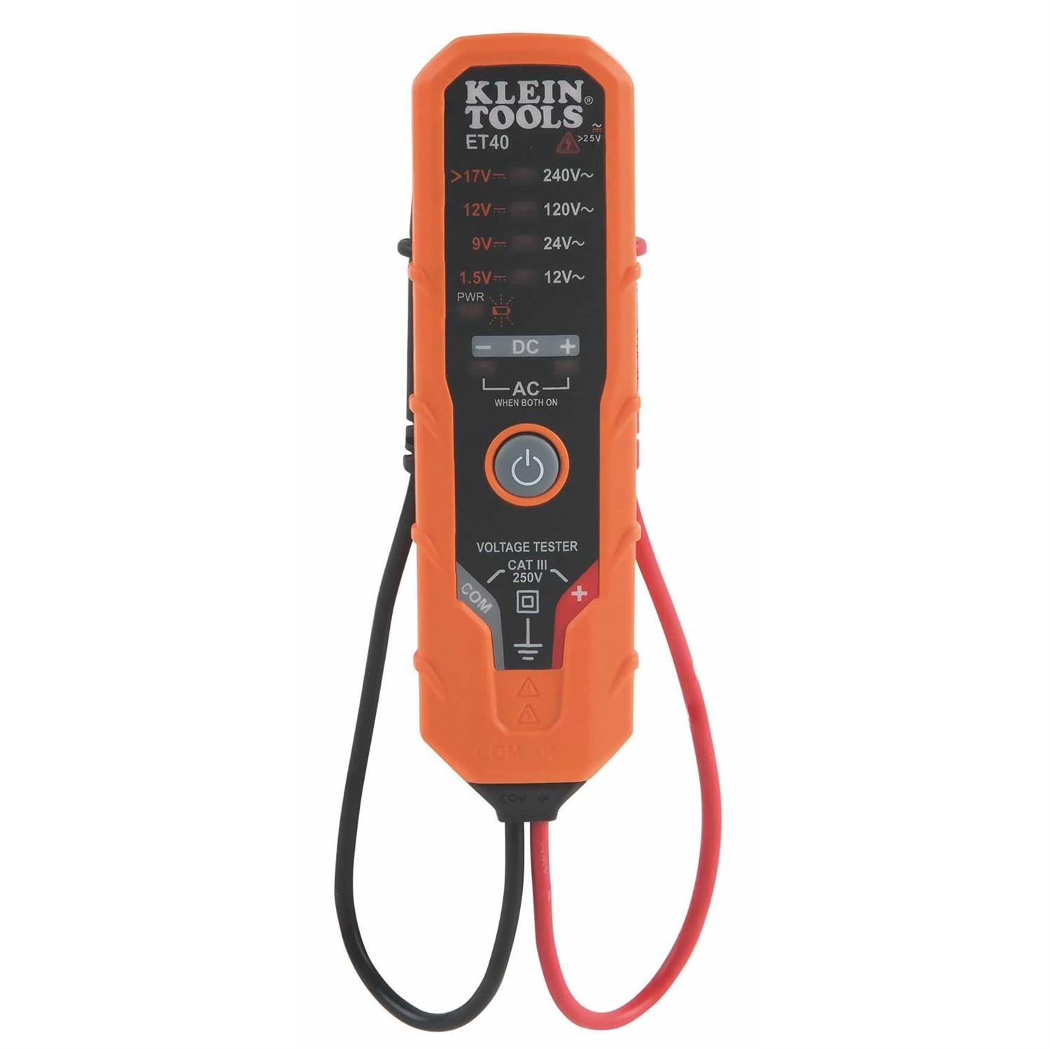 Klein Tools Electronic AC/DC Voltage Tester Klein Tools Electronic AC/DC Voltage Tester Features: Tests AC voltage from 12V to 240V AC Tests DC voltage from 1.5V to greater than 17V to 24V 3-meter drop tested CAT III 250V Class 2 Double insulation IP41 dust and water-resistant Uses 2 x AAA batteries Identifies and distinguishes AC or DC voltages Klein Tools ET40 is an Electronic AC/DC Voltage Tester. It features indicators for positive and negative DC polarity and tests DC voltages as low as 1.5V. It tests AC voltages 12-240VAC. Excellent for checking, verifying or troubleshooting common residential electrical wiring in electrical outlets, light fixtures, doorbells and more. It operates on 2 x AAA batteries.
