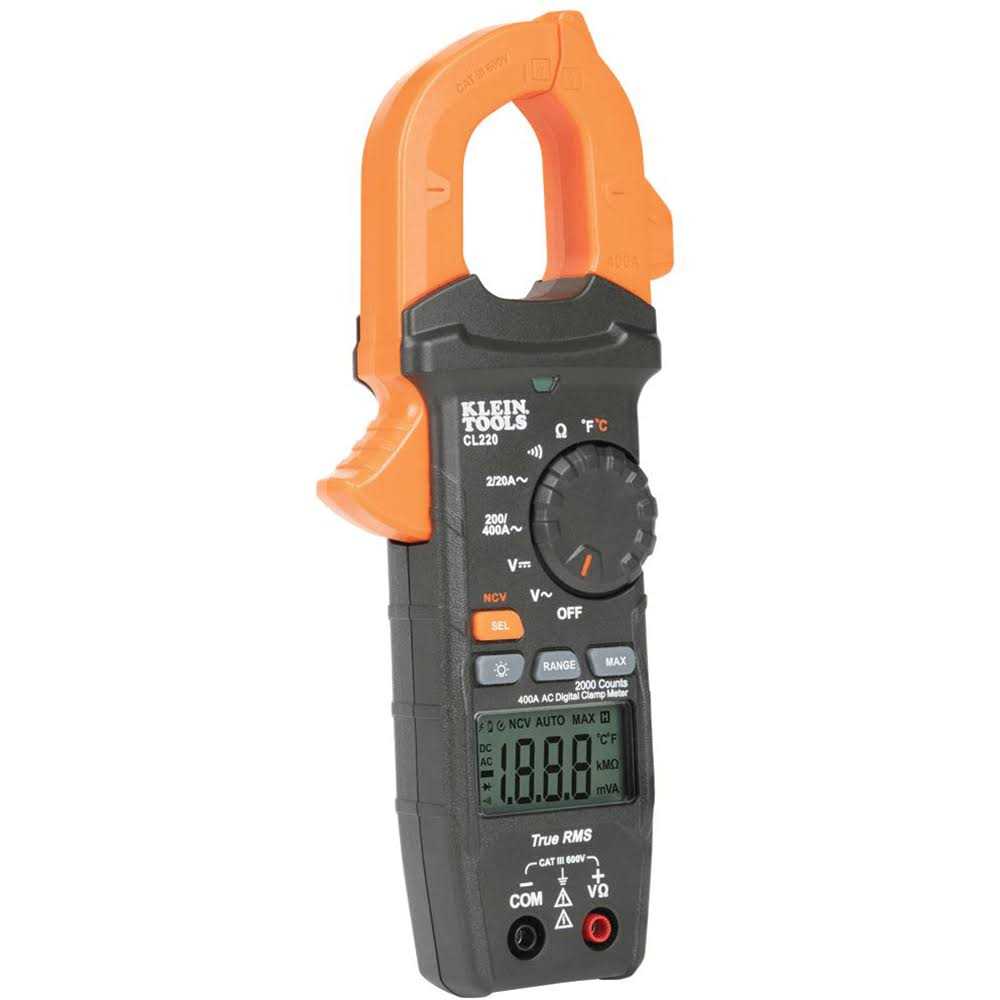 The Klein Tools CL220 is an automatically ranging TRMS digital clamp meter that measures AC current (up to 400A) via the clamp and AC/DC voltage (up to 600V). You can use NCV testing mode with the sensing antenna, red NCV light and audible signals. A non-contact voltage tester is integrated into the clamp jaw. The meter also measures resistance and tests for continuity with test leads, as well as temperature below 446°F/ 230°C via K-type thermocouple probe. It offers Backlight, Range, Max, Data Hold, and Sel/NCV buttons, 2000-count LCD display, test lead holder on side of the clamp, low battery indicator and auto-power off after 10 minutes of inactivity. The unit can withstand a 6.6-ft drop. It has CAT III 600V, Class 2, Double insulation safety rating for use in electromagnetic environments.The CL220 includes the clamp meter, test leads with CAT III/CAT IV safety caps, thermocouple, 3x AAA batteries, instructions and carry case.