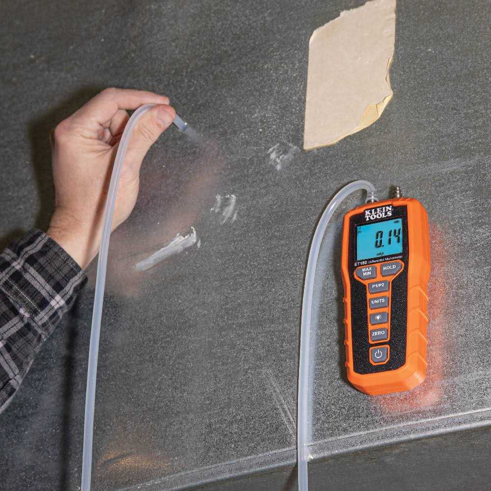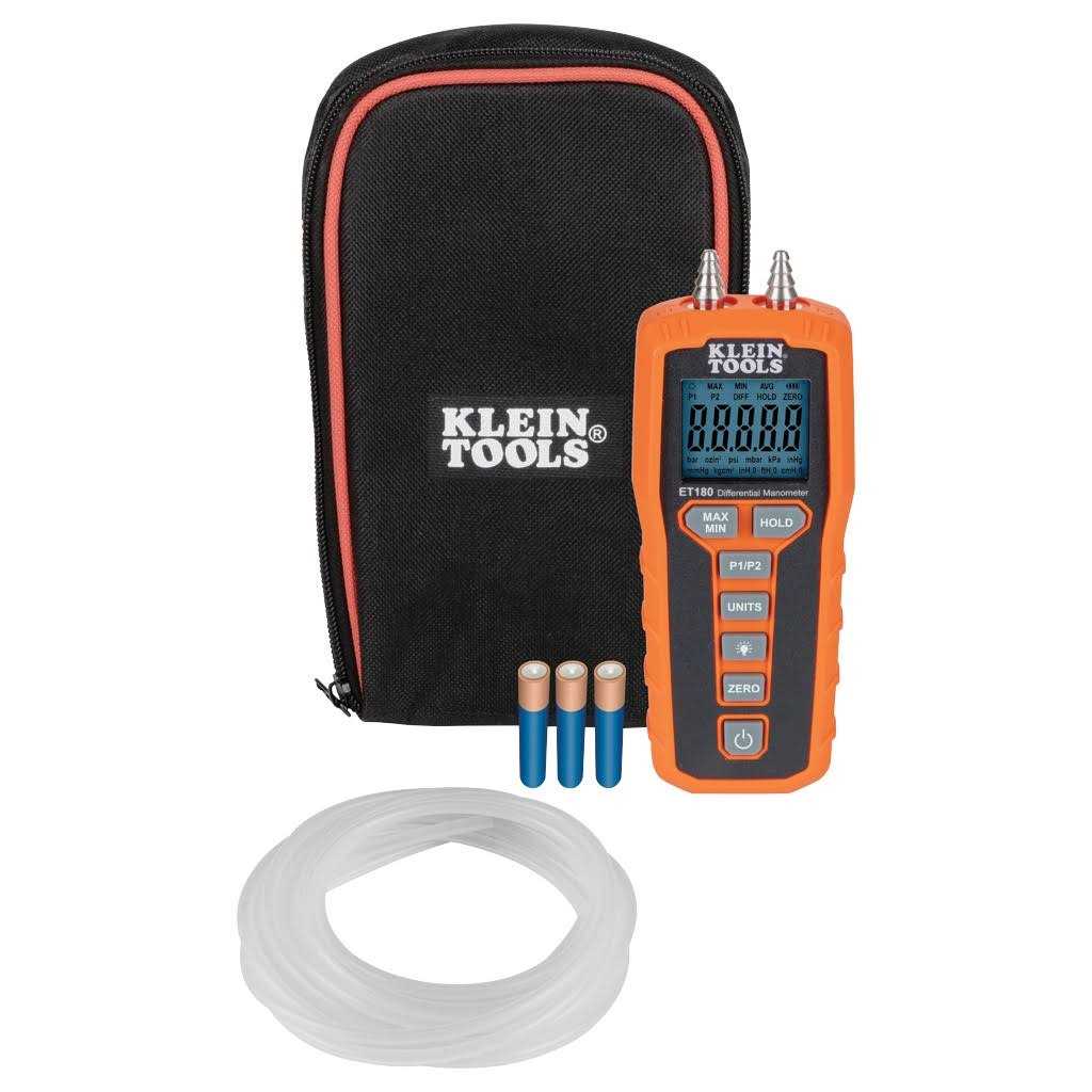 The Klein Tools ET180 is a digital differential pressure manometer to measure static and differential pressure from two ports in air and gas systems. The Klein Tools ET180 measures gas pressure up to +/- 60 WC with a full-scale accuracy of +/- 1.5% to help monitor and troubleshoot problems in HVAC systems.