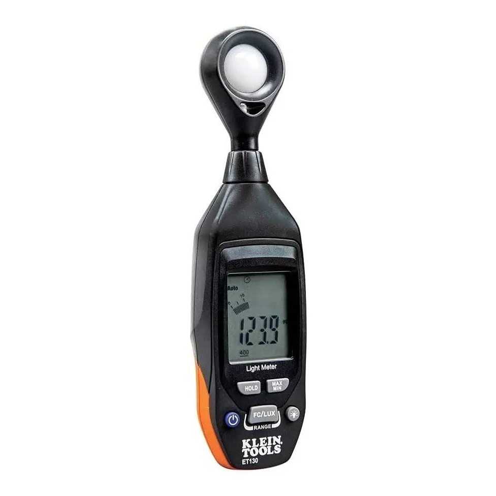 Klein Tools ET130 is an easy-to-use precision light meter that measures illuminance levels in both Foot Candles (FC) and Lux. Backlit LCD display screen with bar graph assists when monitoring light levels and for retrofit projects. Includes custom carrying pouch and 9V battery.