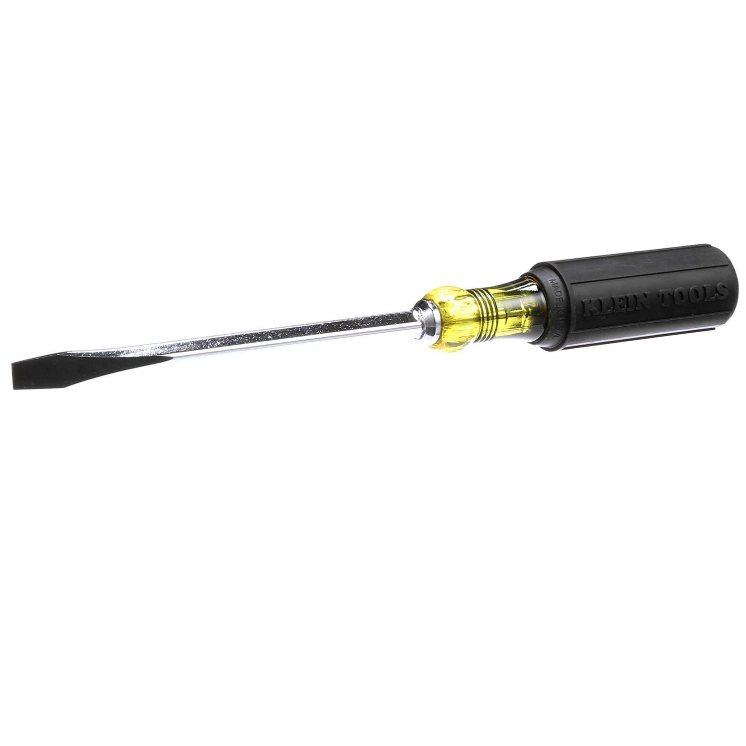 The 5/16-inch keystone tip of the Klein Tools 6-inch flat head screwdriver is made precised for an exact fit. This screwdriver is designed for demanding applications. It features a chrome-plated shaft for a smooth feel and corrosion resistance. The durable has a cushioned grip and integral flanges that provide a twist-resistant blade anchor. Cushion-Grip handle allows for greater torque and comfort. Integral flanges inside handle provide solid, twist-resistant blade anchor. Special heat-treated shank. Precision-machined tip for exact fit. Premium chrome plated for smooth feel and corrosion resistance.