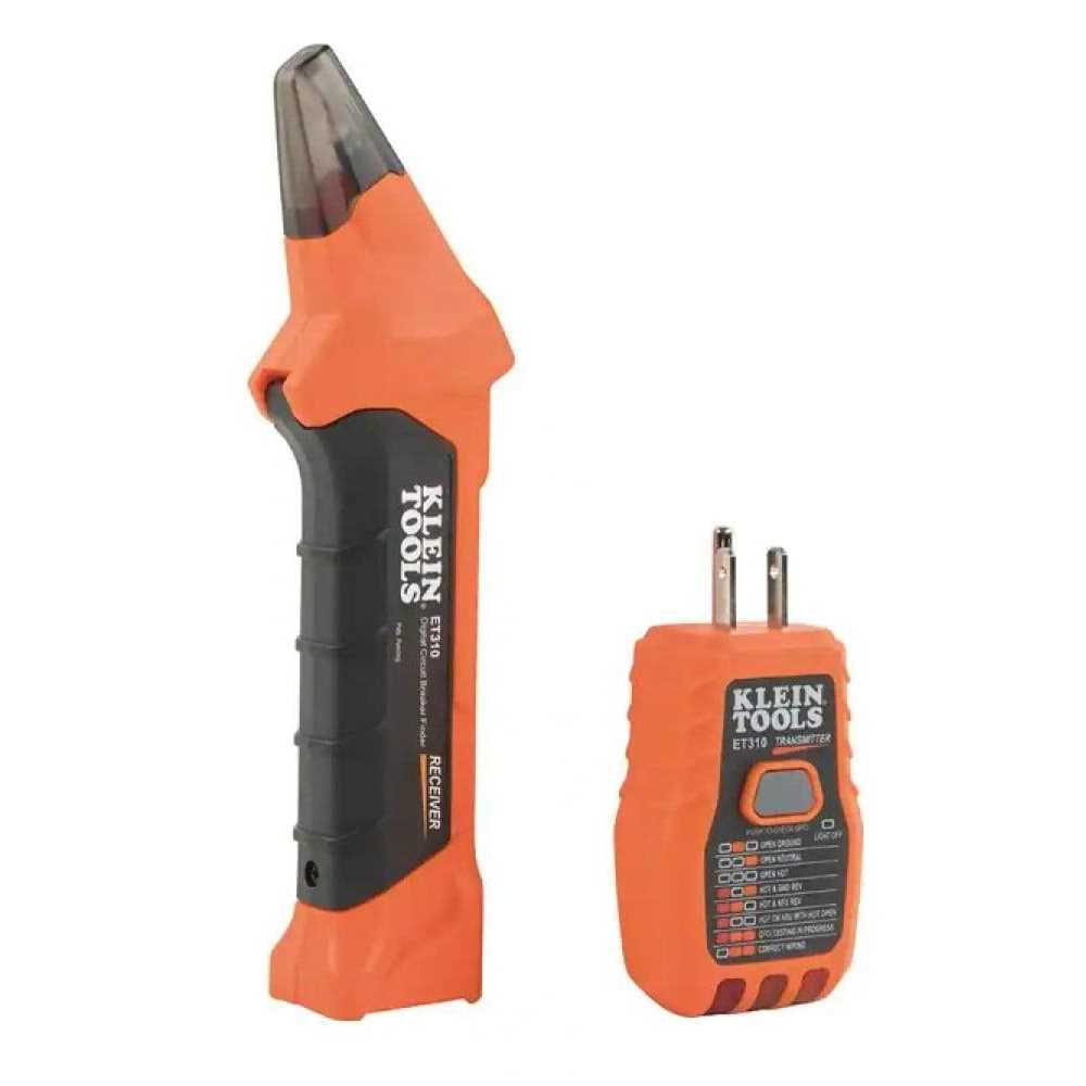 This Digital Circuit Breaker Finder and Accessory Kit includes the Klein Tools model # ET310 Digital Circuit Breaker Finder with GFCI Outlet Tester and the model # 69411 Circuit Breaker Finder Accessory Kit. The Klein Tools ET310 Circuit Breaker Finder with Integrated GFCI Outlet Tester is a digital circuit breaker finder used to locate the correct circuit breaker in a panel to which an electrical outlet or fixture is connected. The Transmitter is connected to the electrical outlet or fixture in the circuit while the receiver is used to scan the breakers in the circuit panel. The Transmitter also features a GFCI outlet tester. The Klein Tools circuit breaker kit allows your circuit breaker finder to do more than just indicate standard circuits. Adapters in this kit indicate the correct breaker of bare wires or other exposed conductors. Adapters also indicate the correct breaker for light fixtures.