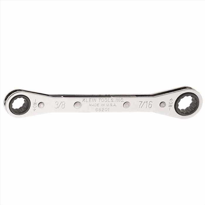 The Klein Tools Ratcheting Box Wrench is great for working in confined spaces and on long studs. This wrench has a different size opening on each end for multiple applications. Get reverse ratcheting action simply by turning the wrench over.