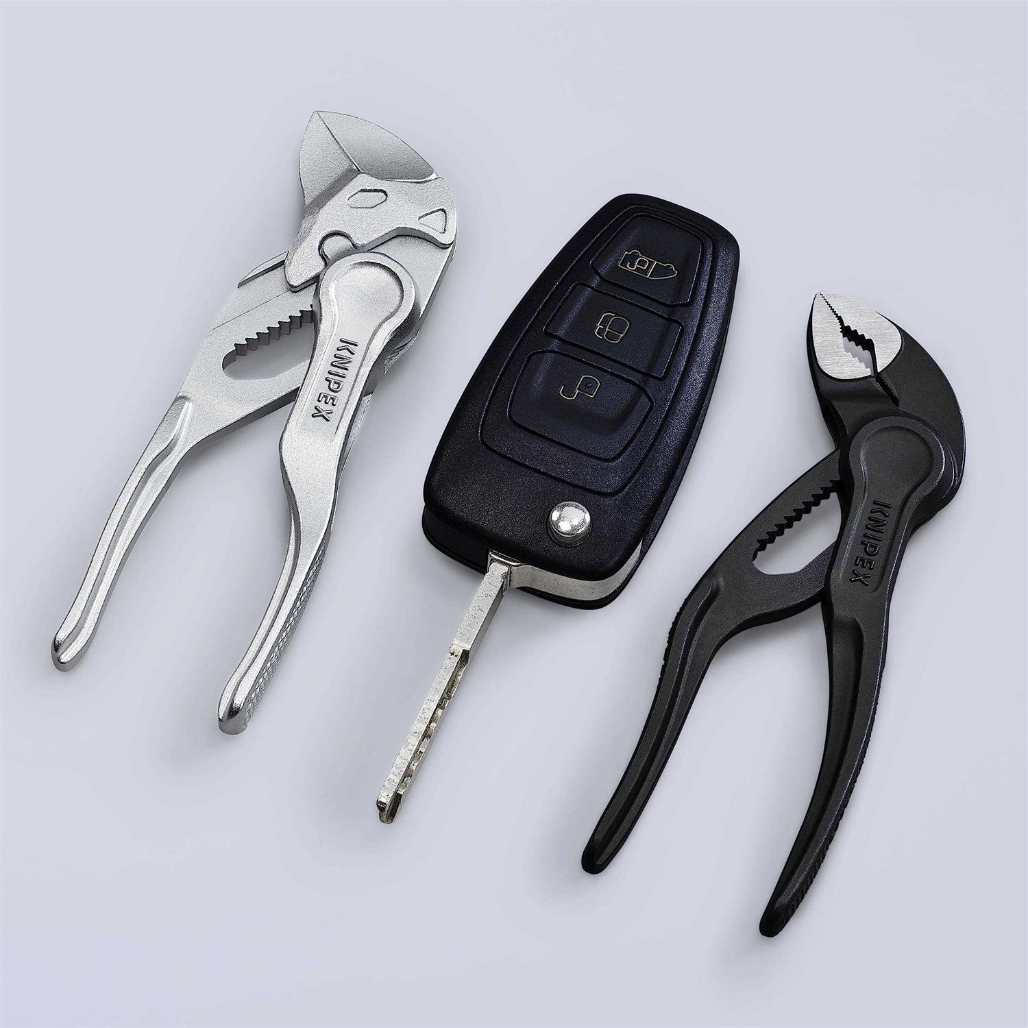 Get the job done with these Knipex XS mini pliers set. Perfect for daily carrying, every set comes in a belt pouch and provides a Cobra XS water pump pliers and XS pliers wrench. At a compact 4 in., both tools grip like big tools, have a pinch guard to prevent fingers being pinched and have texturized handles for a secure grip. The one-handed quick adjustment delivers up to a 1-in. gripping capacity. A slim head on the water pump pliers gives you a firm grip even in tight spaces, self-locking on pipes and nuts and no slipping off the workpiece. You can use the pliers wrench for gripping, holding, pressing and bending applications.