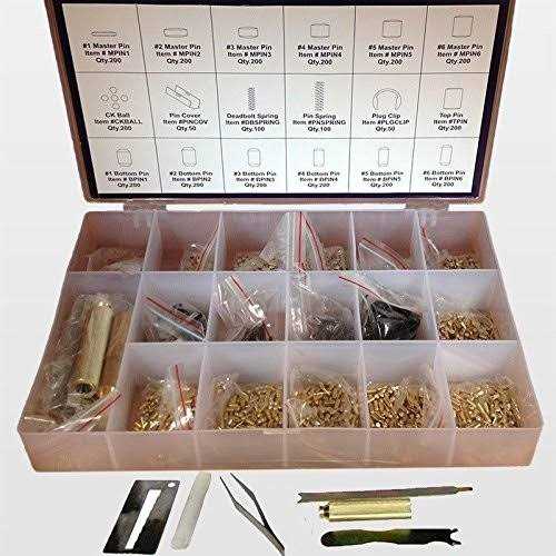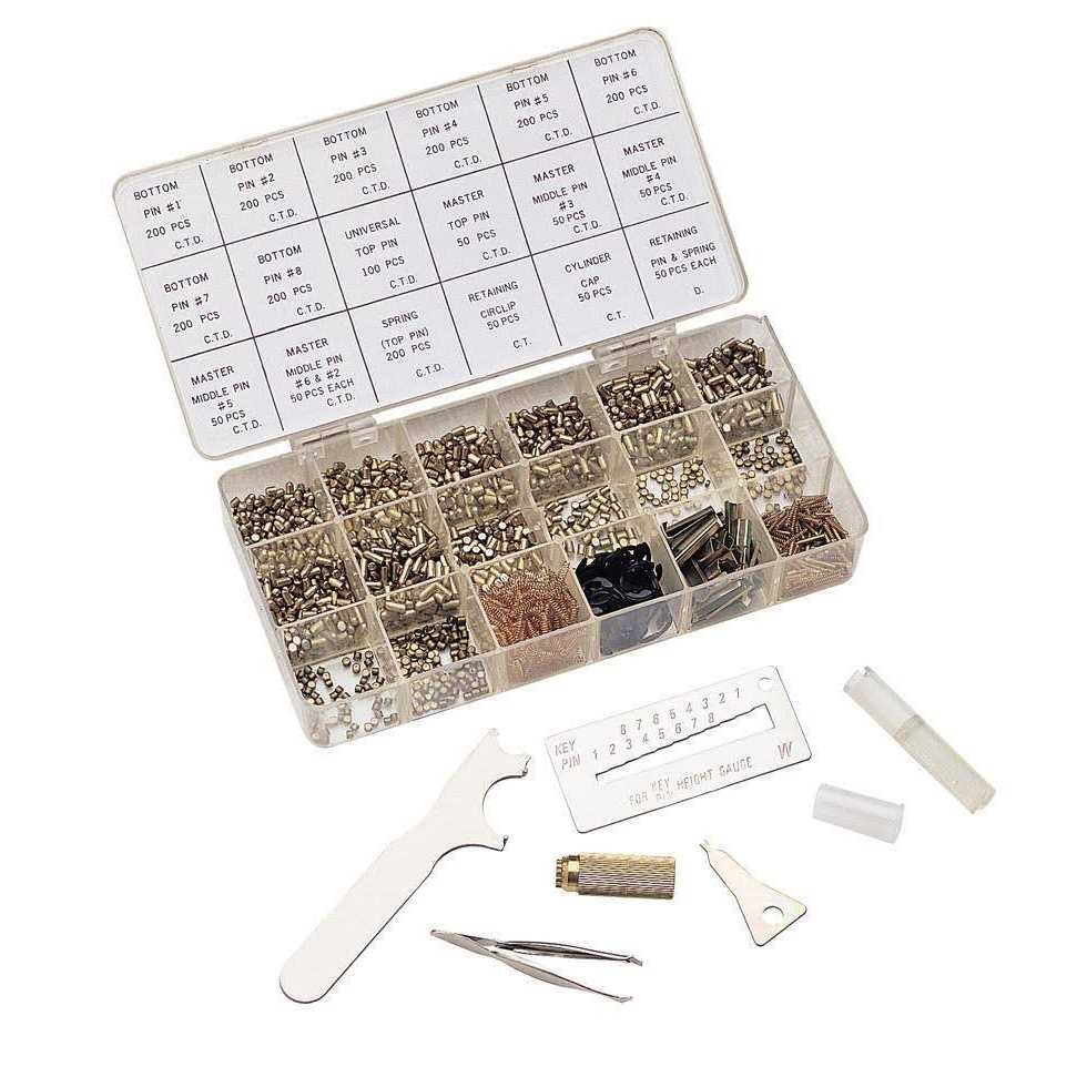 Bottom Pins 1-7 (each 200pc), Universal Top Pin (200 pcs)Master Pins 2-6 (each 200pc), Plug Follower, Pin GaugeCylinder Cover (10pc), Spring (Top Pin)(200 Pcs)Retaining Clips (50pc) Cylinder Cap (50pc), Spanner ToolRetaining Pin & Spring (each 50pcs), Locking Nut Removal ToolPickle Fork