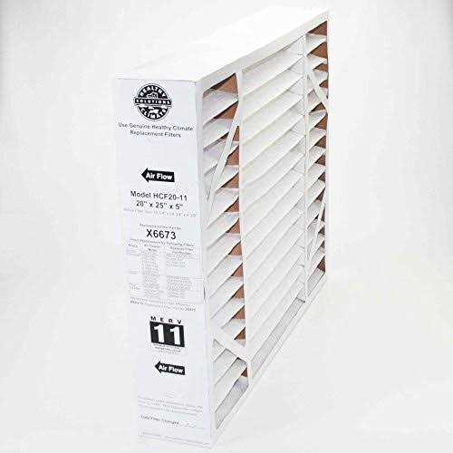 Replacement for HCXF20-10 HCF20-10 20X25X5 MERV 11 Replacement for Lennox X6673 Replacement for EXPXXFIL0020 EXPXXUNV0020 EXPXXLMC0020 FILCCCAR0020 X6673 Replacement Filter for Lennox and Honeywell Replace ment for FC35A1027 FC100A1037 FC200E1037 F35Expandapac This Genuine OEM Lennox replacement filter X6673 is the same as HCF20-10 and fits model number Air Cleaner Cabinet HCC20-28. This MERV 11 filter has a nominal size of 20 x 25 x 5 and an actual size of 19 3/4 x 24 3/4 x 4 3/8. This filter is up to twenty times more effective than ordinary fiberglass filters. High efficiency filter media collects small dust particles before they can collect on your coils. No assembly required…no combs needed…filter just slides right in This product is listed and rated by Underwriters Laboratories as U.L. Class 2.